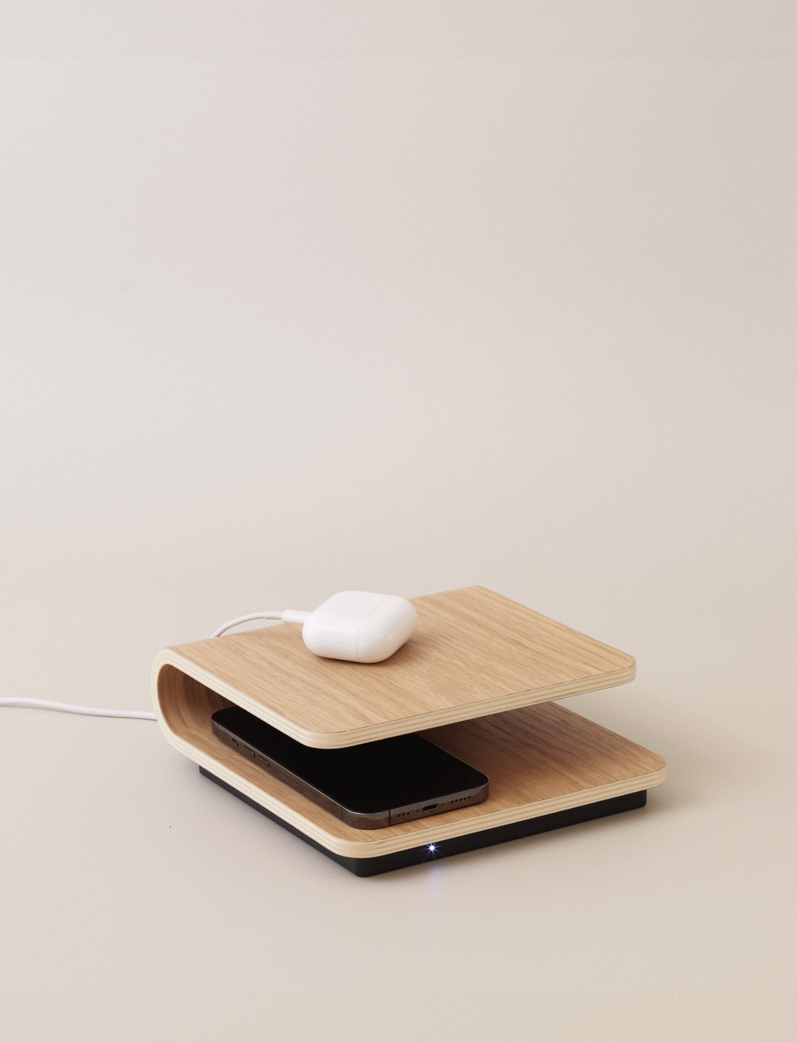 Mit diesem kabellosen Ladegerät aus der RO-Serie verbindest du skandinavisches Handwerk mit modernster Ladetechnologie auf eine Weise, die dein Zuhause sowohl funktional als auch ästhetisch bereichert. Die warme Ausstrahlung des zertifizierten Eichenfurniers macht dieses Ladegerät zu einem echten Blickfang, der sich nahtlos in deine stilvolle Einrichtung einfügt und gleichzeitig als praktisches Zentrum für alle mobilen Geräte der Familie dient.Das durchdachte Design ermöglicht es dir, bis zu vier Geräte gleichzeitig zu laden – zwei davon kabellos und zwei weitere über die integrierten USB-Anschlüsse. So schaffst du einen natürlichen Sammelplatz, an dem sich die ganze Familie versammeln kann, ohne ständig von schwachen Akkus unterbrochen zu werden. Die kabellose Qi-Technologie funktioniert dabei denkbar einfach: Lege einfach dein kompatibles Smartphone oder andere Geräte auf die Ladefläche, und der Ladevorgang startet automatisch.