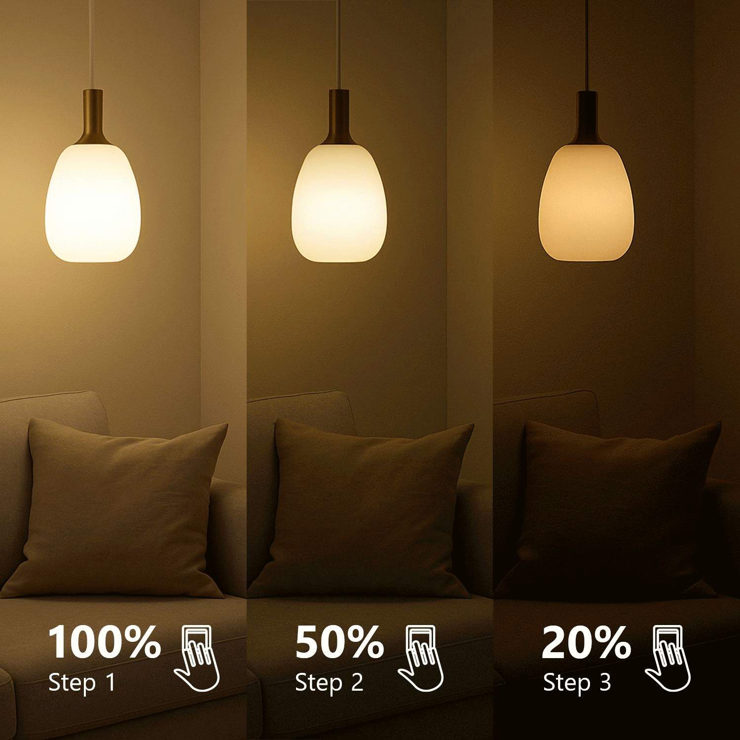- 3-Stufen-Dimmung über gewöhnlichen Lichtschalter (100%, 50%, 20%)