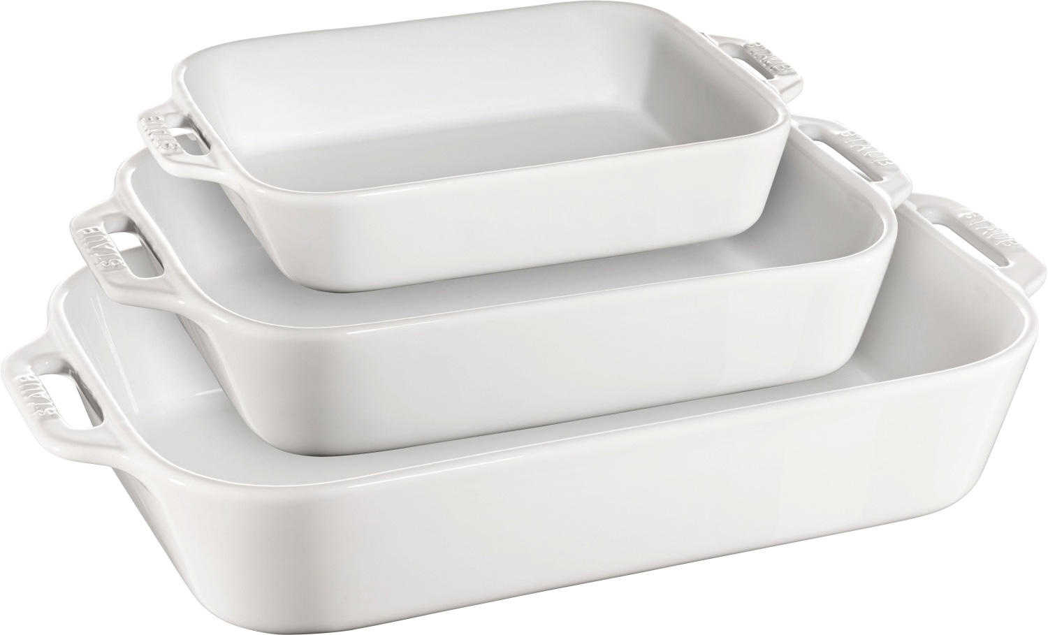 Mit diesem eleganten 3er-Set Auflaufformen von Staub holst du dir französische Küchenexpertise direkt in dein Zuhause. Die drei weißen Keramikformen vereinen die bewährte Handwerkskunst des renommierten französischen Herstellers mit modernem Design und höchster Funktionalität für anspruchsvolle Hobbyköche.Jede Form besteht aus hochwertigem Steinzeug, das für eine optimale Wärmeverteilung sorgt und die Temperatur deutlich länger hält als herkömmliche Auflaufformen. Das besondere Material absorbiert keine Feuchtigkeit, wodurch du bei jedem Gebrauch konsistente und köstliche Ergebnisse erzielst. Die glänzende Porzellanglasur verleiht nicht nur eine wunderschöne Oberfläche, sondern harmoniert perfekt mit Staubs ikonischen Gusseisenprodukten – so kreierst du eine stilvolle und einheitliche Tischgestaltung.