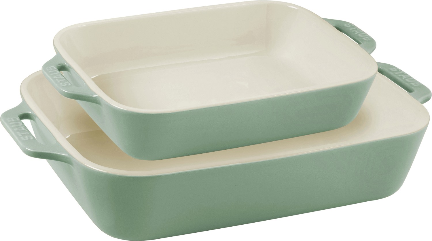 Mit diesem eleganten 2er-Set ovnfaste Auflaufformen von Staub Ceramique holst du dir authentische französische Küchenkultur direkt nach Hause. Die zwei praktischen Größen decken alle deine Zubereitungsbedürfnisse ab und verwandeln jede Mahlzeit in ein kulinarisches Erlebnis. Die handgefertigten keramischen Formen in der wunderschönen Eukalyptusfarbe verbinden Funktionalität mit ästhetischem Design so perfekt, dass sie sowohl als Zubereitungsgeschirr als auch als Serviergeschirr brillieren.Das Set besteht aus zwei Formen in den Größen 20 x 16 cm und 27 x 20 cm, die dir maximale Flexibilität für kleine und große Portionen bieten. Die rechteckige Form maximiert die Oberfläche optimal – ideal für die perfekte knusprige Kruste bei Gratins. Die keramische Konstruktion sorgt für gleichmäßige Wärmeverteilung während der gesamten Zubereitungszeit und garantiert professionelle Kochergebnisse.