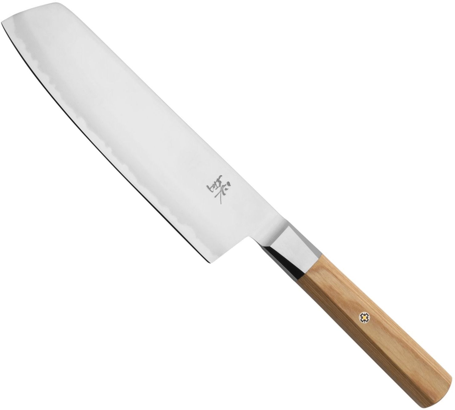 Der japanische Name verrät bereits die Bestimmung dieses Meisterwerks: "na" bedeutet Gemüse und "kiri" steht für schneiden. Mit einer Klingenlänge von 170 mm ist dieses Nakiri Messer speziell für das präzise Schneiden von Gemüse entwickelt worden, überzeugt aber ebenso beim Bearbeiten von Fleisch und anderen Zutaten. Die flache, breite Klinge gleitet mühelos durch selbst härtestes Gemüse und liefert dabei perfekte, gleichmäßige Schnitte.