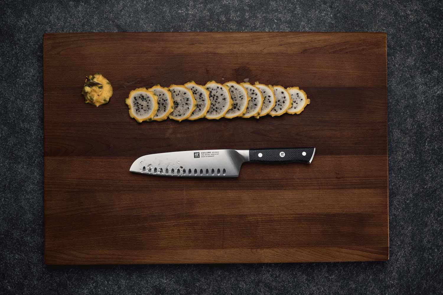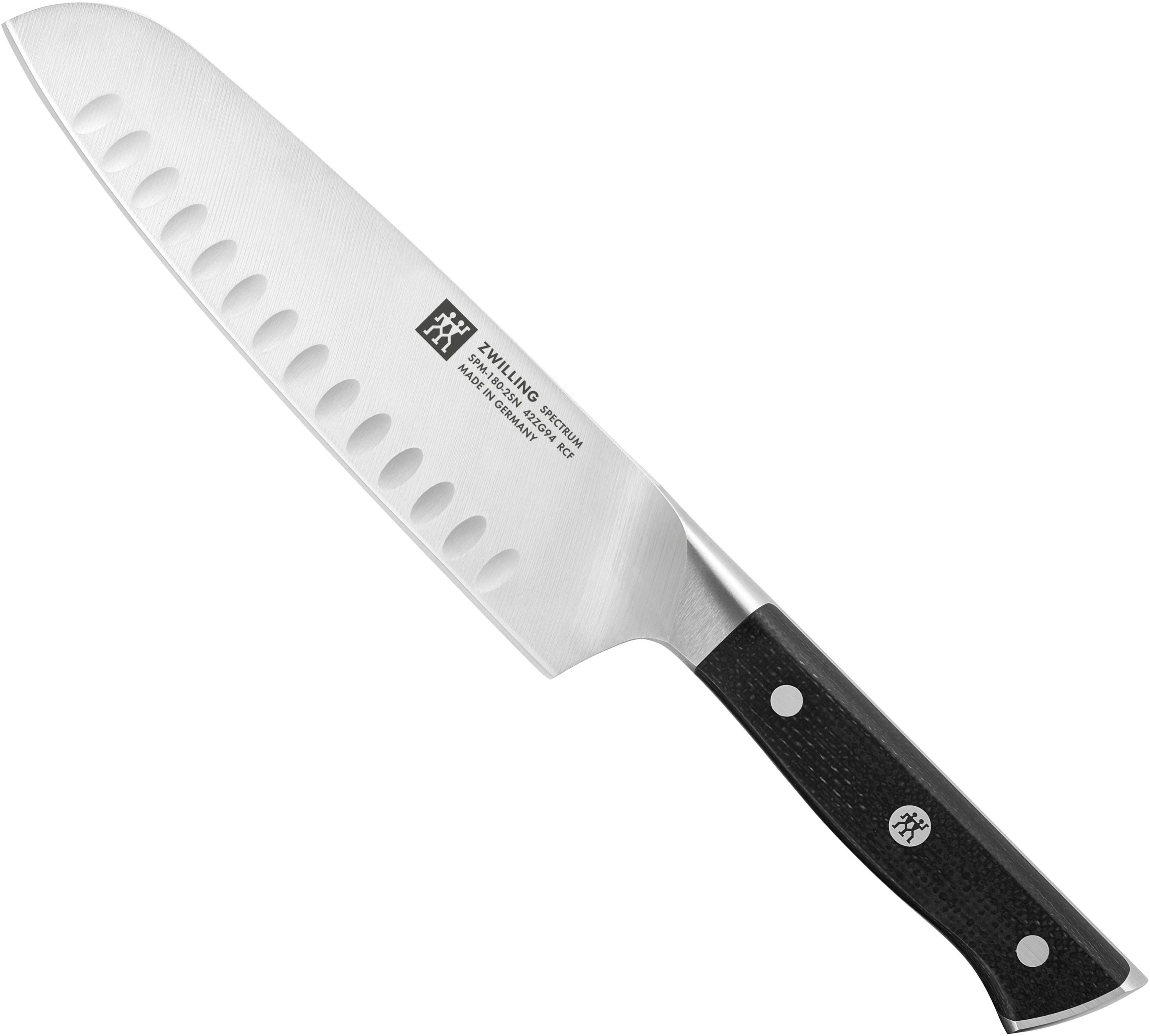 Mit seinem eleganten schwarzen Finish fügt sich das SPECTRUM Santokumesser perfekt in jedes moderne Küchenambiente ein und verbindet Funktionalität mit Ästhetik auf beeindruckende Weise.