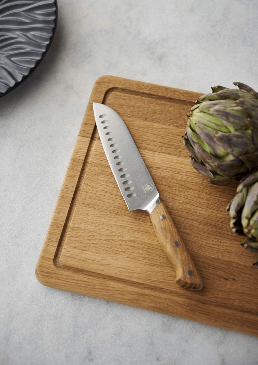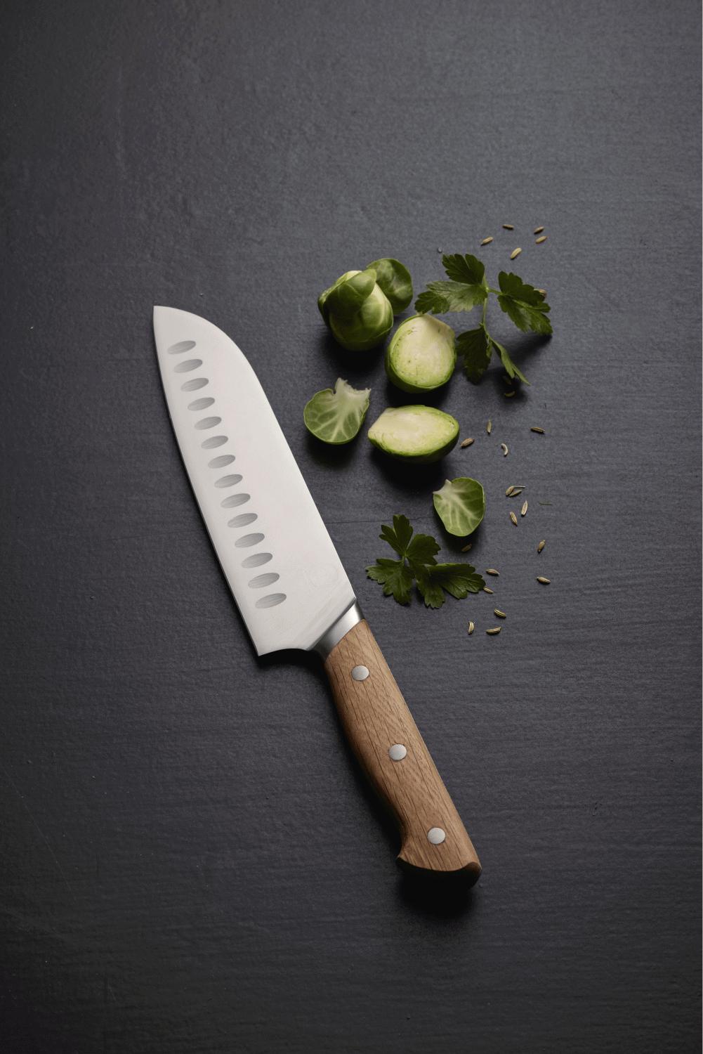Der Griff aus einem durchgehenden Stück FSC®-zertifizierter Eiche (FSC-C166612) liegt nicht nur perfekt in der Hand, sondern entwickelt mit der Zeit eine wunderschöne, persönliche Patina. Obwohl das Santokumesser seinen Ursprung in Japan hat und besonders für Präzisionsarbeit mit Gemüse geeignet ist, eignet es sich auch hervorragend zum Zerlegen von Fisch und Fleisch. Es stellt somit ein unverzichtbares Werkzeug für jeden dar, der Qualität und Vielseitigkeit in der Küche schätzt.