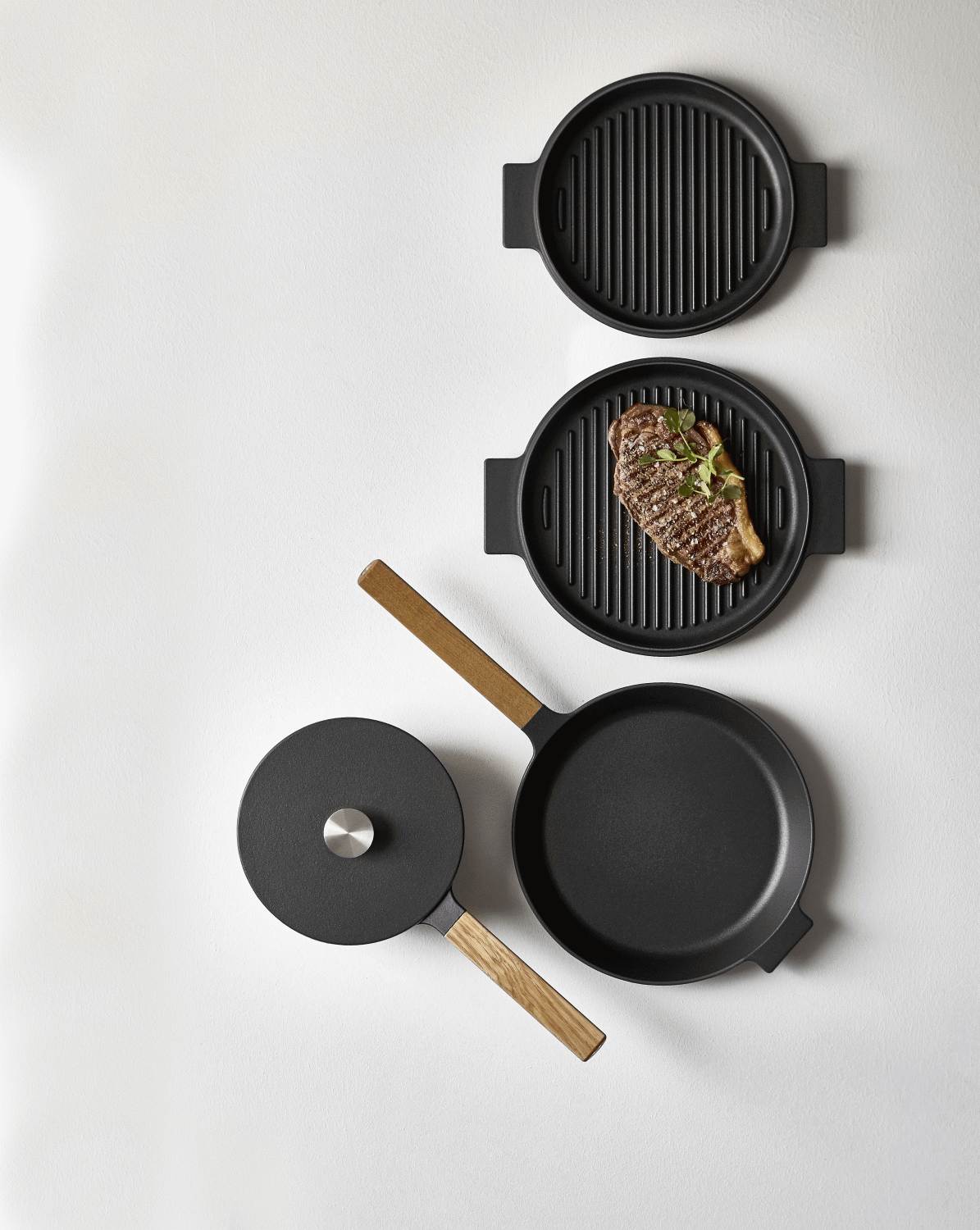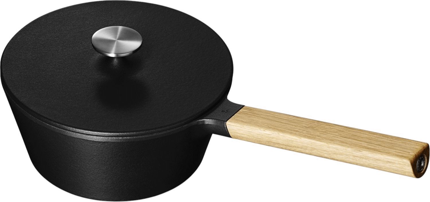 Besonders beeindruckend sind die durchdachten Details: Die eleganten Griffe aus geöltem Eichenholz bilden einen wunderschönen warmen Kontrast zum schwarzen Gusseisen und liegen angenehm in der Hand. Der praktische Deckel ist mit einem hochwertigen Edelstahlknopf ausgestattet und ermöglicht effizientes Garen durch optimale Dampfzirkulation.