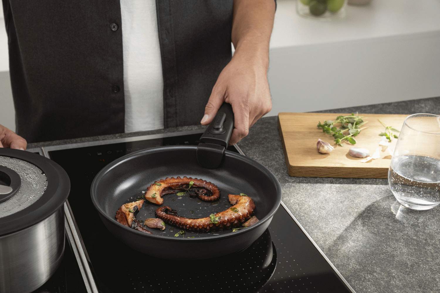 Der abnehmbare Griff ist das innovative Kernelement des UNLOCK-Systems und ermöglicht dir eine platzsparende Aufbewahrung in Schrank oder Schublade – ideal für kleinere Küchen, in denen jeder Zentimeter zählt. Mit einem einfachen Klick befestigst oder entfernst du den Griff, was dir maximale Flexibilität bietet. Du kannst die Pfanne problemlos vom Herd direkt auf den Tisch oder in den Kühlschrank stellen, ohne Speisen umfüllen zu müssen. Das spart nicht nur Zeit, sondern reduziert auch Abwasch und Lebensmittelverschwendung.