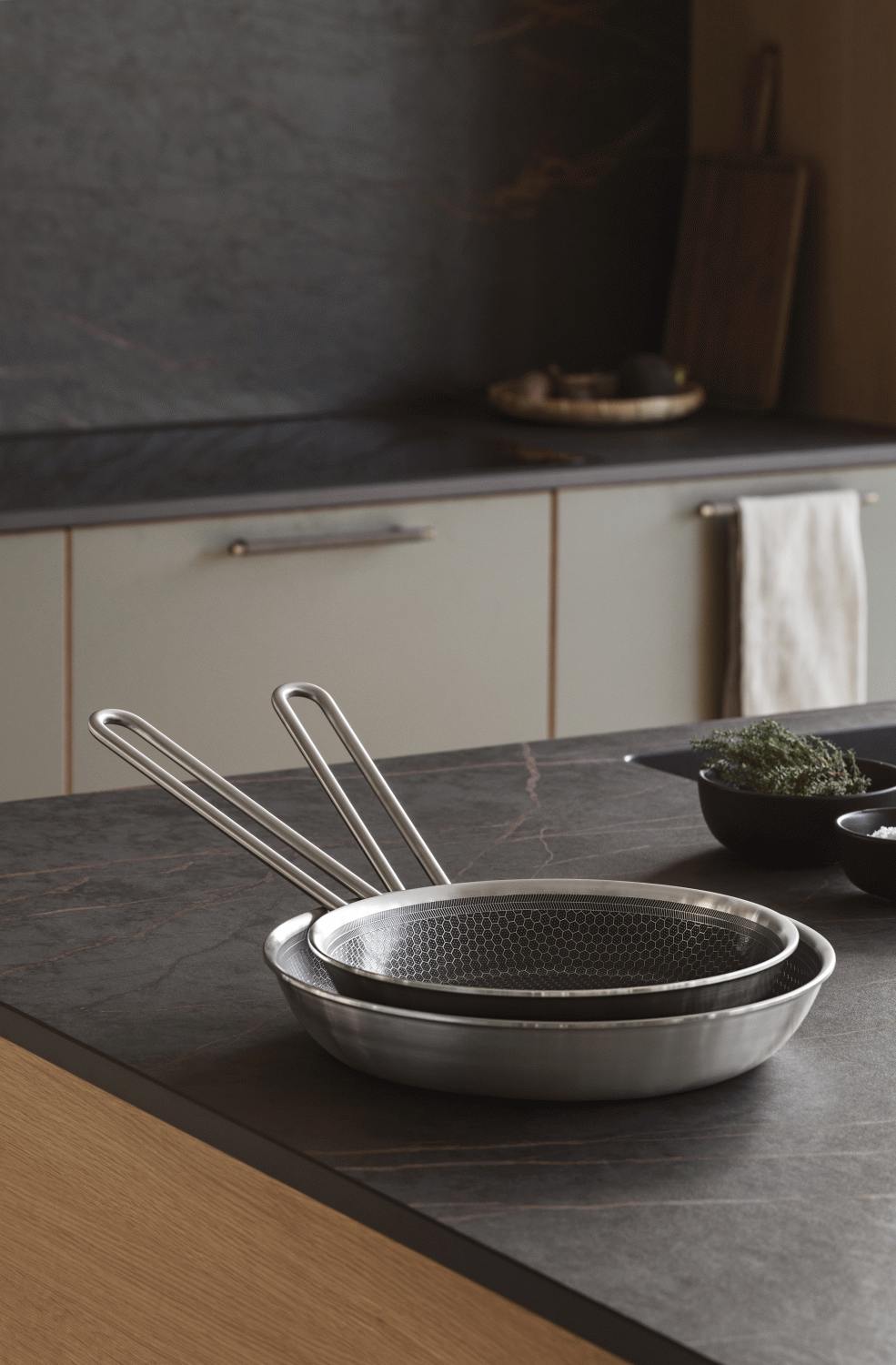 Die bahnbrechende keramische Beschichtung ermöglicht es dir, die Menge an Fett deutlich zu reduzieren, während du trotzdem die perfekte Bräunung erzielst. Gleichzeitig gestaltet sich die Reinigung kinderleicht. Der Pfannenkörper besteht aus einer nachhaltigen Kombination von 90 Prozent recyceltem Post-Consumer-Edelstahl und 100 Prozent recyceltem Post-Consumer-Aluminium – ein echter Beitrag zum Umweltschutz in deiner Küche.