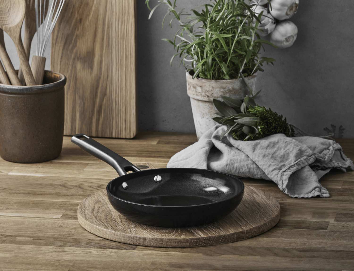 Die schwarze keramische Beschichtung innen und außen verleiht der Pfanne eine moderne, stilvolle Optik, die perfekt zum skandinavischen Küchendesign passt. Dank der Aluminiumkonstruktion erhältst du eine schnelle und gleichmäßige Wärmeverteilung, sodass deine Gerichte jedes Mal perfekt gelingen. Die keramische Antihaftbeschichtung sorgt dafür, dass nichts anbrennt und du weniger Fett beim Kochen benötigst.