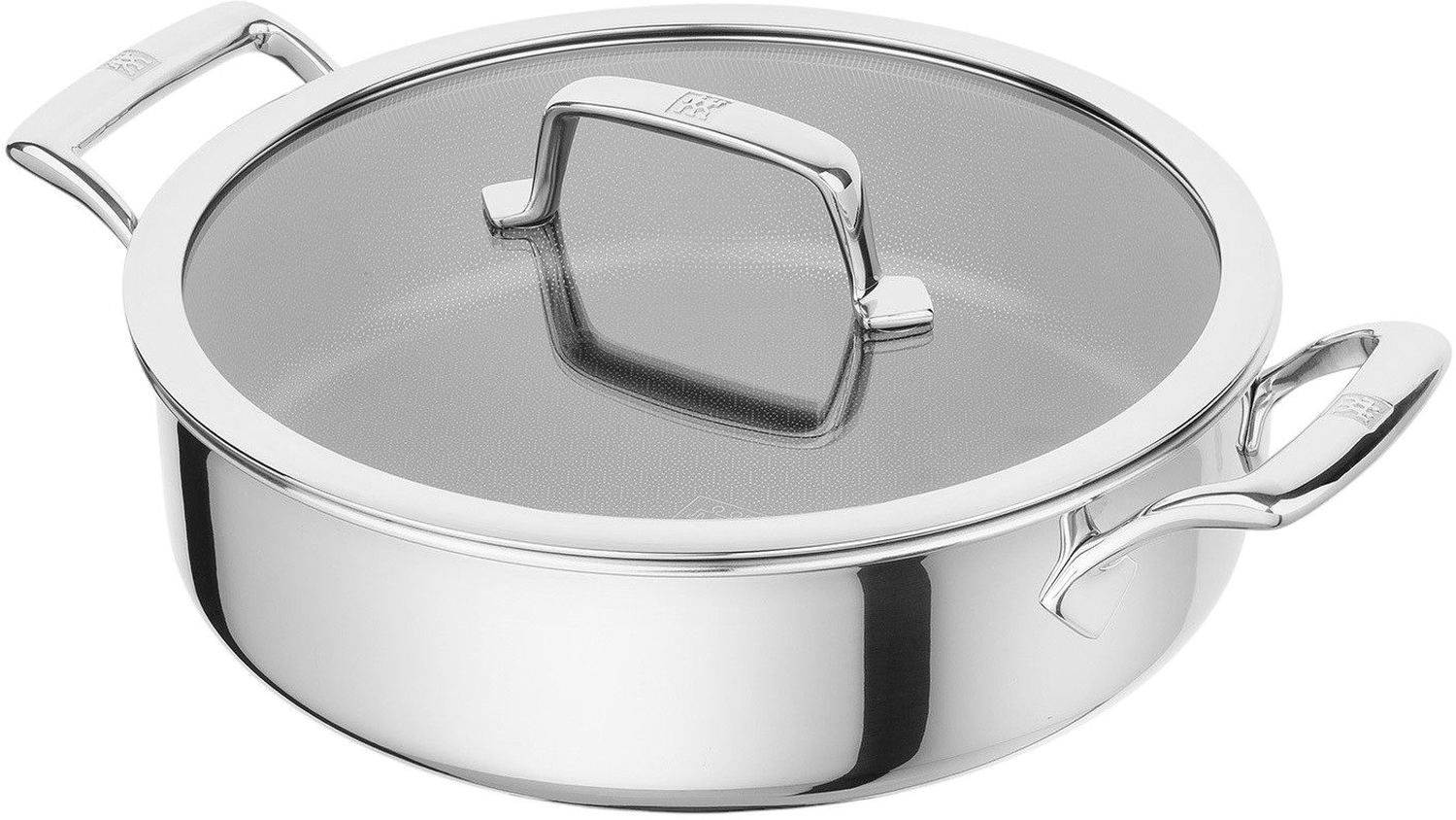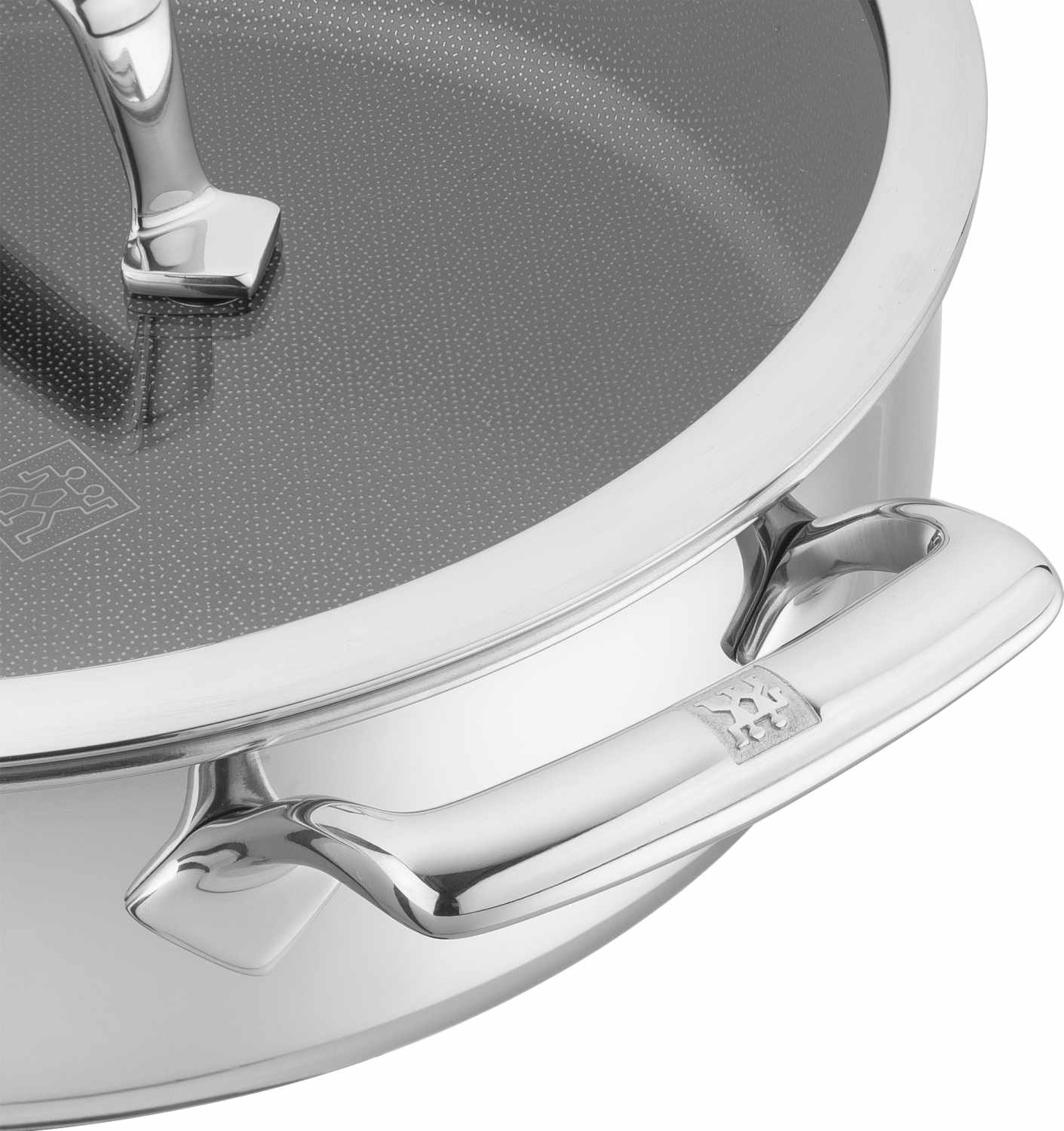 Die praktische Konstruktion macht diese ZWILLING PEAK Servierpfanne zu einem wahren Arbeitstier in deiner Küche. Du kannst bedenkenlos Metallutensilien verwenden, ohne Kratzer befürchten zu müssen, und nach dem Kochen wandert die Pfanne einfach in die Spülmaschine für mühelose Reinigung. Das hochwertige 18/10 Edelstahl sorgt für optimale Wärmeverteilung und bewahrt das ästhetische Erscheinungsbild der Pfanne über Jahre hinweg.