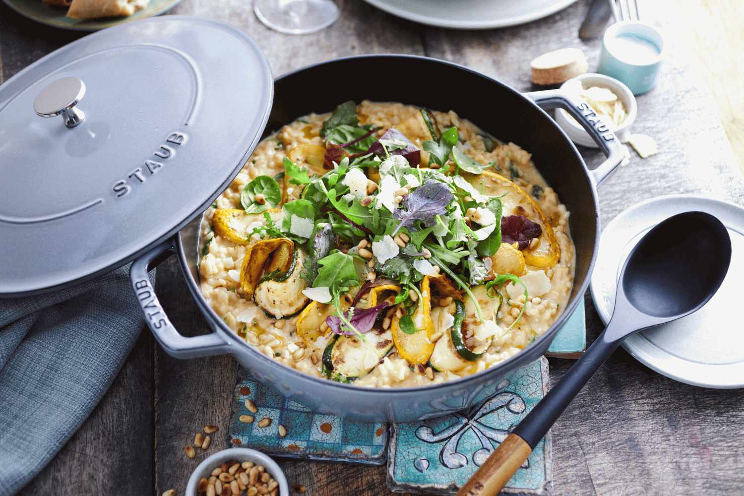 Dank der ergonomisch gestalteten Griffe kannst du die Pfanne sicher handhaben, während ihr ästhetisches Erscheinungsbild sie ideal für das Servieren direkt vom Herd zum Tisch macht. Von langsam geschmorten Fleischgerichten über bunte vegetarische Ratatouilles bis hin zu saisonalen Eintöpfen – diese multifunktionale Schmorpfanne eröffnet dir endlose kulinarische Möglichkeiten.