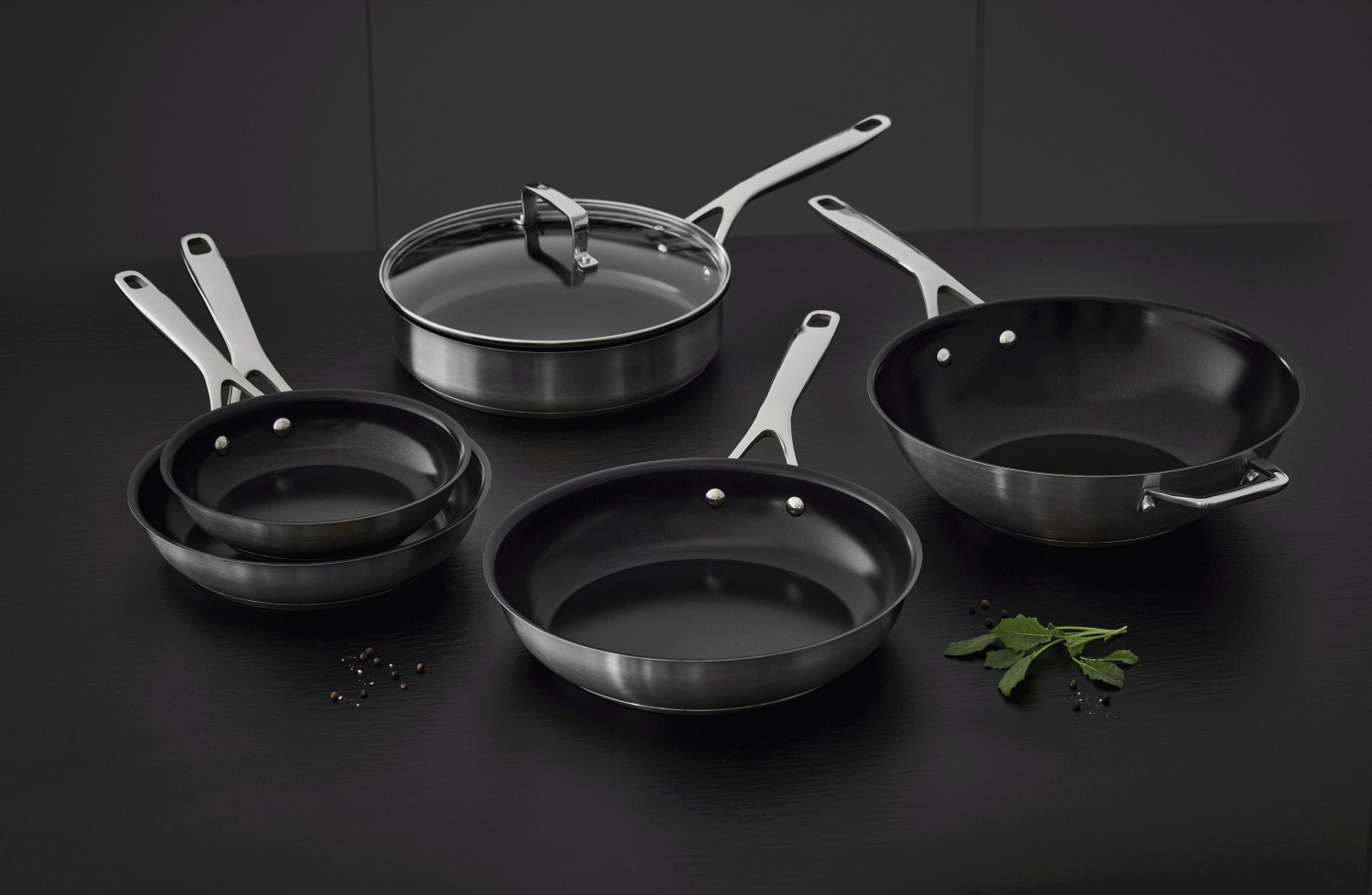 Das erstklassige 18/8 Edelstahlmaterial mit eleganter Satinoberfläche sorgt für eine gleichmäßige Wärmeverteilung und außergewöhnliche Langlebigkeit. Die innovative 2-Schicht-Keramik-Antihaftbeschichtung macht das Kochen nicht nur gesünder, da du minimal Fett benötigst, sondern verhindert auch zuverlässig das Anbrennen oder Anhaften der Speisen während der Zubereitung.