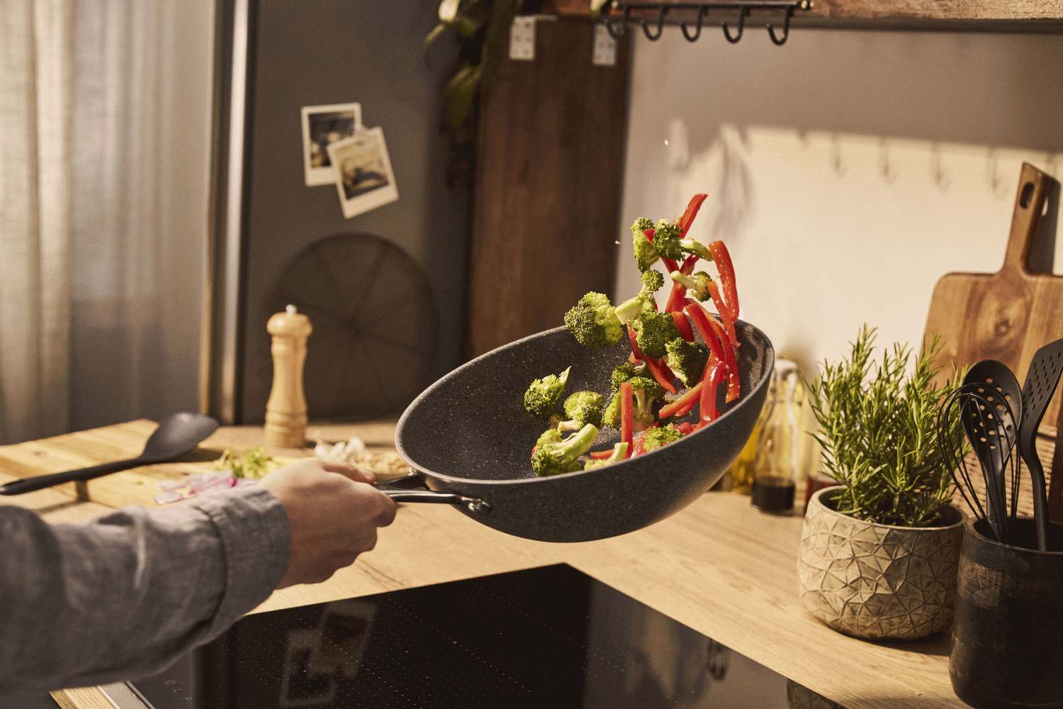 Die Stone Grey Farbgebung verleiht der Wokpfanne einen modernen und zeitlosen Ausdruck, der perfekt in jede Kücheneinrichtung passt. Der neutrale Farbton hebt sowohl die Zutaten, die du zubereitest, als auch die Ästhetik deiner Küche hervor.