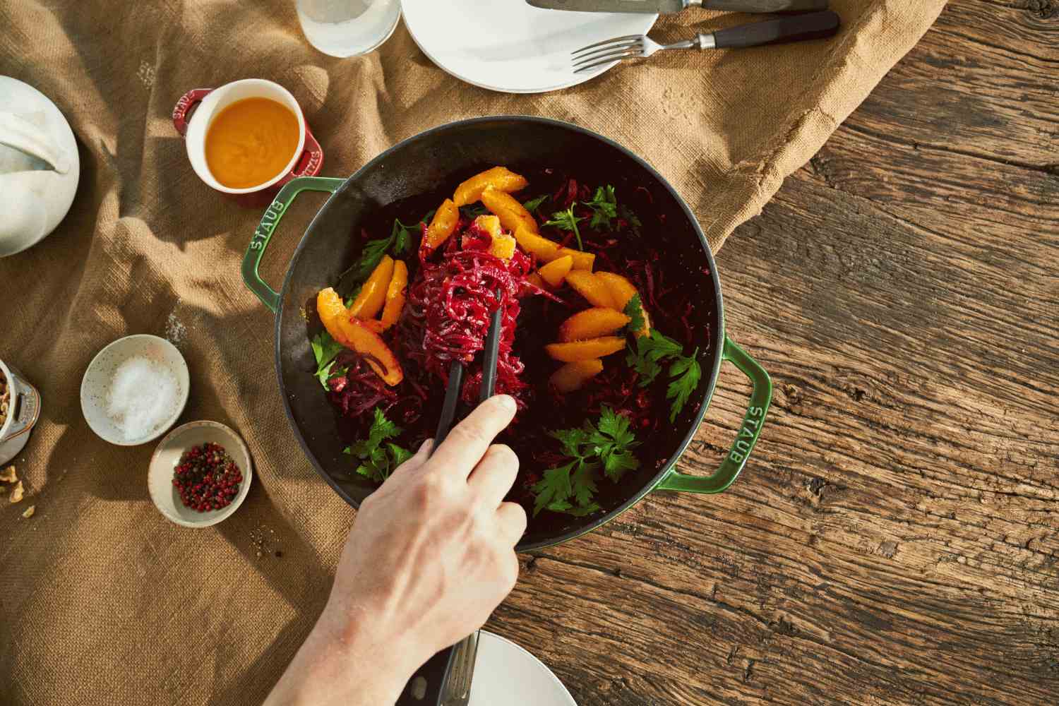 Diese hochwertige Staub Wokpfanne aus Gusseisen in der wunderschönen basilikumgrünen Farbe holt die authentische asiatische Kochkultur direkt in deine Küche. Mit ihrer charakteristischen Halbkugelform und außergewöhnlichen Wärmeverteilung ermöglicht dir diese 30 cm Wokpfanne die Zubereitung gesunder und geschmackvoller Gerichte in Rekordzeit.Gusseisen erweist sich als das perfekte Material für das Wok-Kochen, da es die Wärme speichert und gleichmäßig an die Zutaten abgibt. Dadurch behalten Gemüse, Fisch und Fleisch ihre natürliche Textur, Farbe und Nährstoffe, während die Zubereitungszeit minimal bleibt. Das Ergebnis sind Gerichte, die frisch schmecken und die perfekte al dente-Konsistenz aufweisen.