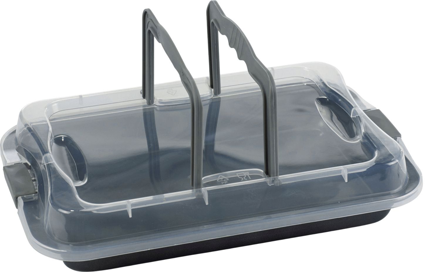 Diese vielseitige Bräterform aus robustem Stahl vereint Backen und Servieren in einem praktischen Küchenhelfer, der mit durchdachten Details für moderne Küchenliebhaber entwickelt wurde. Die Funktion Bräterform mit ihrem praktischen Deckel eignet sich perfekt zum Transport von selbstgebackenen Kuchen, Brötchen oder anderen Leckereien zu Familienfeiern und geselligen Zusammenkünften.Die effektive Antihaftbeschichtung sorgt dafür, dass sich dein Gebäck mühelos aus der Form löst und reduziert gleichzeitig den Reinigungsaufwand nach dem Gebrauch erheblich. Mit den Maßen 36 x 23 x 4,8 cm bietet die Form großzügig Platz für sowohl große Kuchen als auch mehrere Reihen von Kleingebäck. Die integrierten Griffe gewährleisten einen sicheren Halt, wenn du die Bräterform in den Ofen schiebst oder gefüllt mit Köstlichkeiten transportierst.