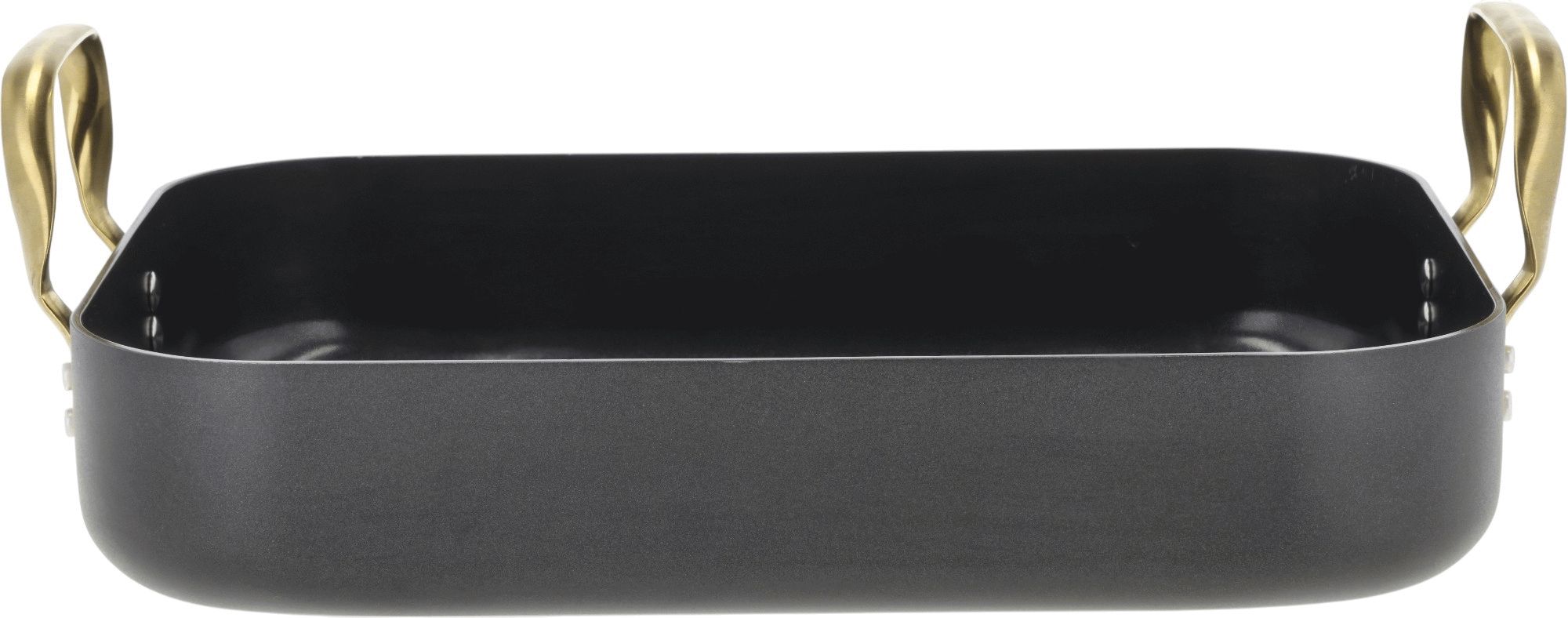 Diese hochwertige Bratpfanne aus der HOLM Brasserie-Serie vereint Funktionalität mit stilvollem Design und wird zu deinem unverzichtbaren Küchenhelfer. Die 34x26 cm große Pfanne überzeugt durch ihre leichte Aluminiumkonstruktion in Kombination mit einer modernen keramischen Antihaftbeschichtung, die das Kochen gesünder und einfacher macht.Die keramische Innenbeschichtung sorgt dafür, dass nichts anbrennt, wodurch du weniger Fett benötigst und die Reinigung zum Kinderspiel wird. Das elegante schwarze Äußere mit den matten messingfarbenen Griffen verleiht der Bratpfanne einen sophistizierten Ausdruck, der perfekt in jede moderne skandinavische Küche passt.