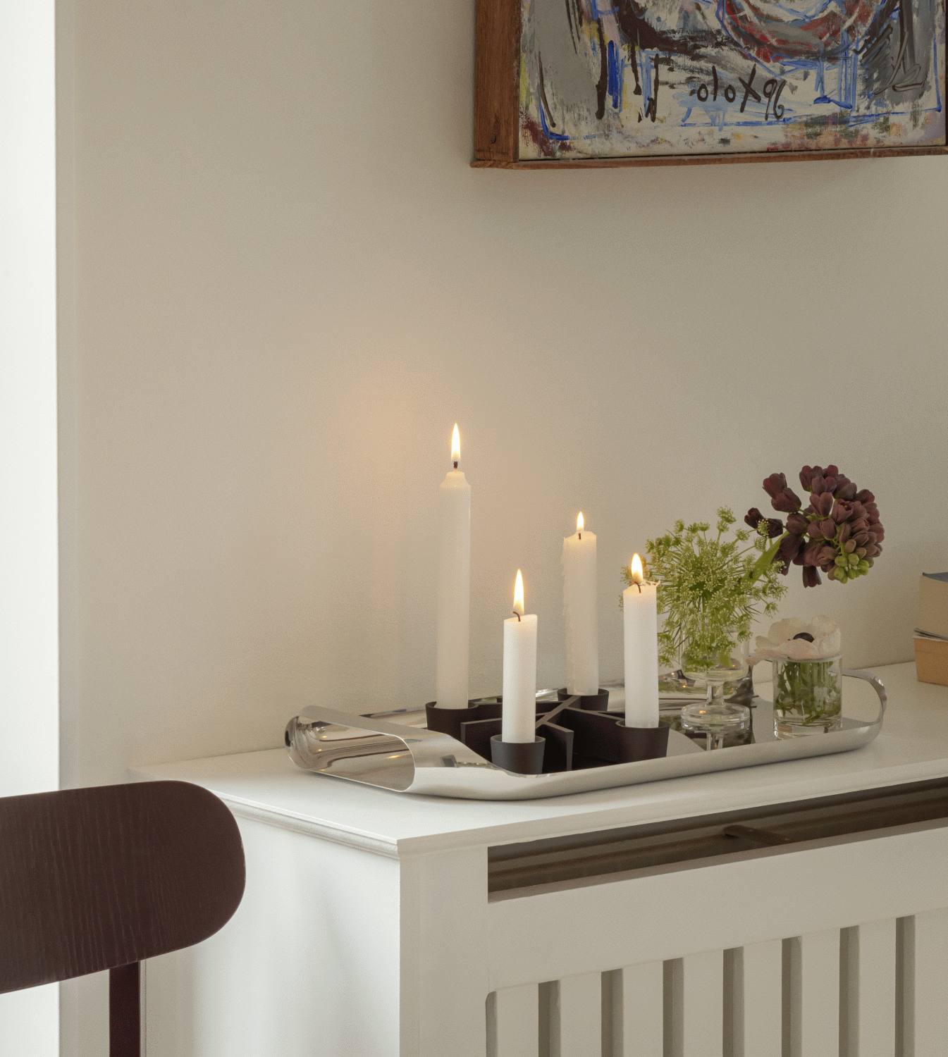 Die handwerkliche Qualität zeigt sich in jedem Detail: Das Aluminium wird sorgfältig gegossen und erhält seine charakteristische matte Oberfläche, die nicht nur elegant aussieht, sondern auch praktisch ist. Der Kerzenhalter ist robust und langlebig, während sein geringes Gewicht das Umstellen und Neuarrangieren zum Vergnügen macht.