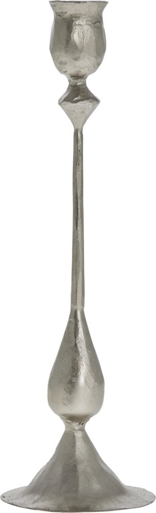 Die schlanke Silhouette des 27 cm hohen Kerzenhalters verleiht jedem Raum eine elegante vertikale Dimension, während die sanft geschwungenen Details einen femininen Touch zum robusten Eisenmaterial hinzufügen. Das hochwertige Eisen wurde mit einem wunderschönen silberfarbenen Finish veredelt, das eine vintage-inspirierte Oberfläche mit subtilen Texturdetails bietet. Diese besondere Oberflächenbehandlung reflektiert das Licht auf eine Weise, die Tiefe und Charakter in jede Raumgestaltung bringt.