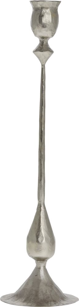 Das schlanke, verlängerte Profil mit seinen sanft geschwungenen Details schafft eine harmonische Balance, die sofort ins Auge fällt. Das robuste Eisenmaterial mit seinem exklusiven silberfarbenen Finish verleiht deinen Räumen einen Hauch von nostalgischer Elegance, während die subtile Oberflächentextur für zusätzlichen Charakter und Tiefe sorgt. Mit einer beeindruckenden Höhe von 33,5 cm wird dieser Kerzenhalter zum markanten Statement-Piece, das Aufmerksamkeit erregt, ohne den Raum zu dominieren.
