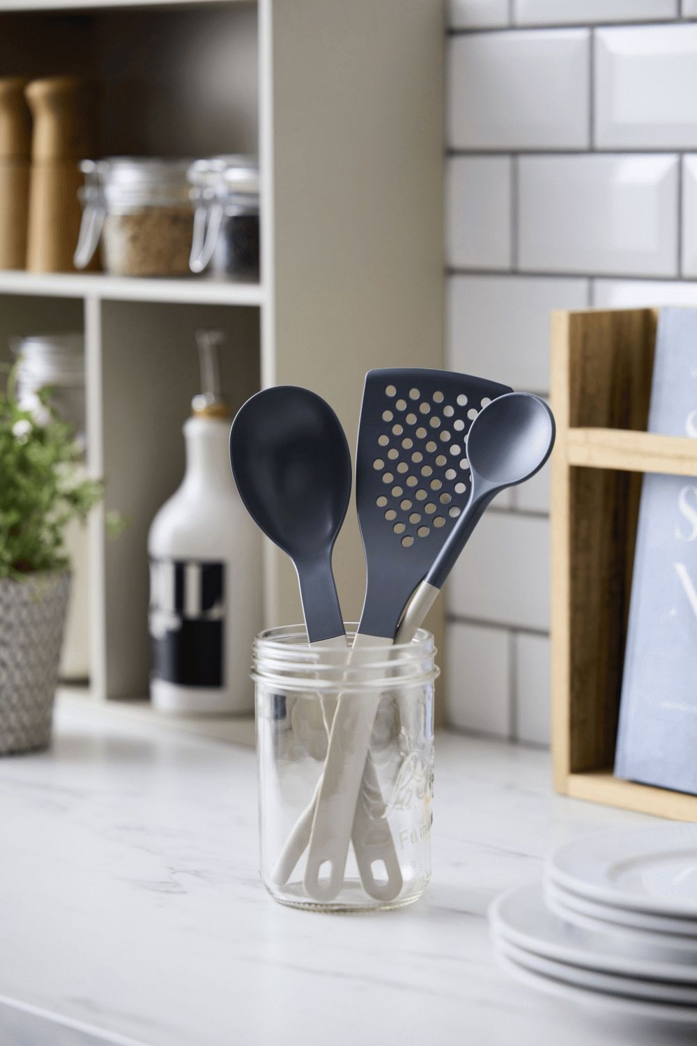 Die hochwertigen Utensilien bestehen aus strapazierfähigem Nylon, das schonend zu allen Arten von beschichteten Töpfen und Pfannen ist. Das ergonomische Design liegt angenehm in der Hand und reduziert die Belastung bei längerem Kochen. Jedes Utensil verfügt über ein praktisches Aufhängeloch für einfache Aufbewahrung und ist spülmaschinenfest für mühelose Reinigung.
