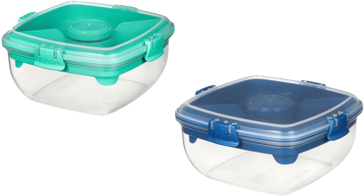 Mit diesem praktischen 2er-Set Sistema To Go Salatboxen bringst du frische, gesunde Mahlzeiten überallhin mit. Die beiden 1,1-Liter-Boxen in den attraktiven Farben Ocean Blue und Minty Teal verwandeln deine Art, unterwegs zu essen, und sorgen dafür, dass du immer eine köstliche und nahrhafte Mahlzeit zur Hand hast – egal wohin dich dein Tag führt.Das durchdachte Design mit separaten Fächern ist der Schlüssel für optimale Frische. Du kannst Salat und Gemüse in einem Bereich aufbewahren, während Fleisch, Nüsse oder andere Beilagen ihr eigenes separates Fach erhalten. So vermeidest du, dass deine knusprigen Zutaten weich werden oder ihr appetitliches Aussehen verlieren. Die intelligente Aufteilung hält alle Komponenten deines Salats perfekt getrennt, bis du bereit bist zu essen.
