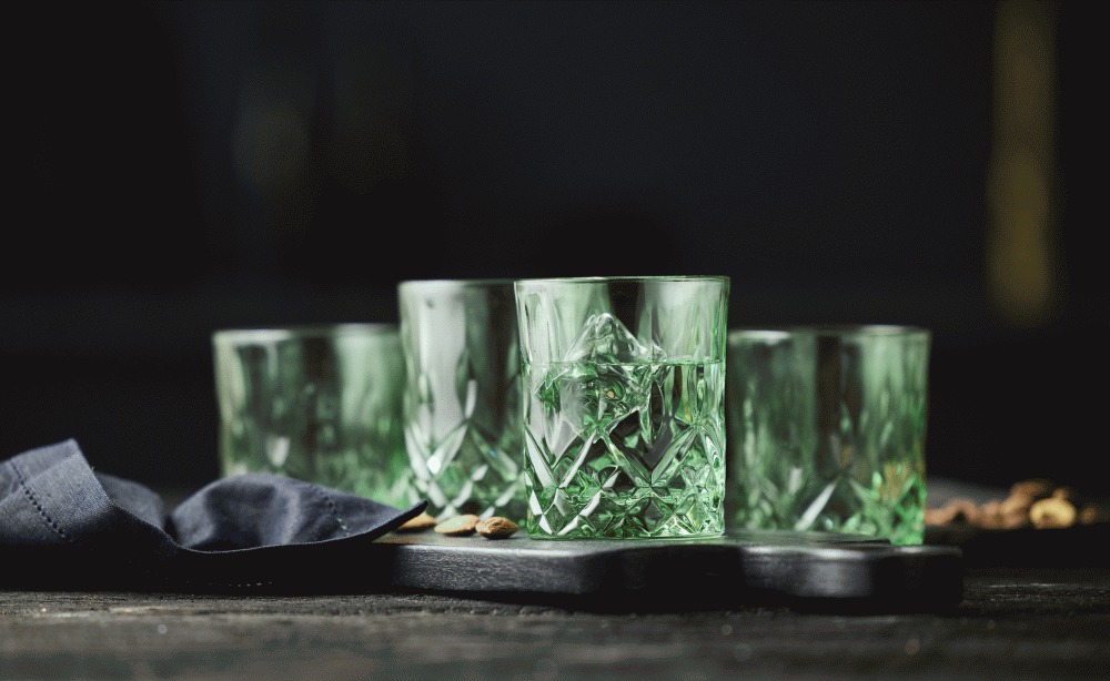 Mit diesem exquisiten 4er-Set Whiskygläser von Lyngby Glas verwandelst du jeden Moment des Genusses in ein besonderes Erlebnis. Die Sorrento Whiskygläser vereinen elegantes skandinavisches Design mit praktischer Funktionalität in einer wunderschönen grünen Farbgebung, die sofort ins Auge fällt.Das facettierte Design dieser Gläser erzeugt ein faszinierendes Lichtspiel, das sowohl die Form des Glases als auch deinen bevorzugten Drink hervorhebt – ob du nun einen exklusiven Whisky, erfrischendes Wasser oder geschmackvollen Saft genießt. Die grüne Farbe verleiht deinem Tisch einen sophistizierten Ausdruck und gibt der Präsentation eine einzigartige Dimension.