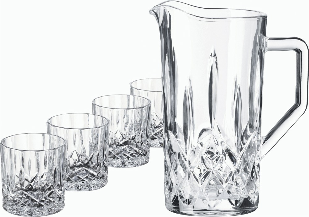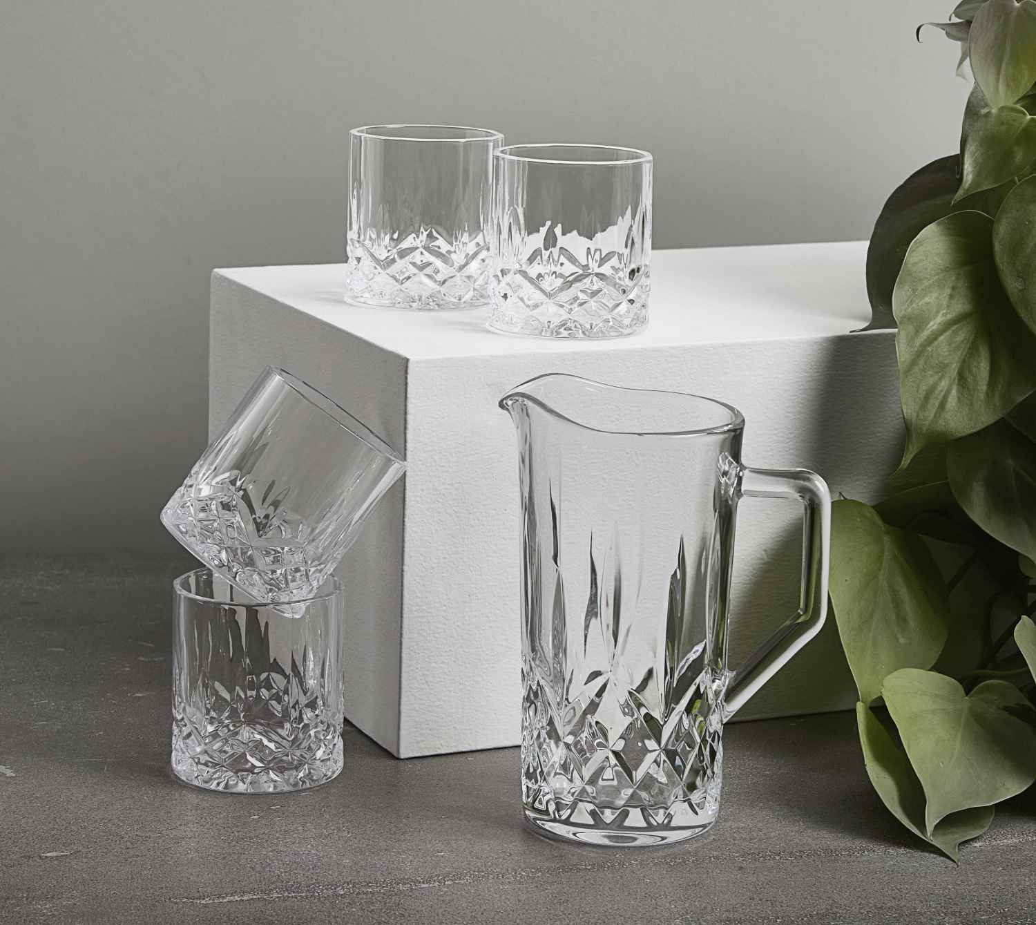 Das 5-teilige Set vereint eine stilvolle Karaffe mit vier passenden Whiskygläsern, alle gefertigt aus robustem Sodaglas mit der gleichen ikonischen Facettenschliffoptik. Diese durchgängige Designlinie sorgt für eine harmonische Gesamtwirkung, die sowohl bei festlichen Zusammenkünften als auch bei intimen Momenten zu Hause perfekt zur Geltung kommt.