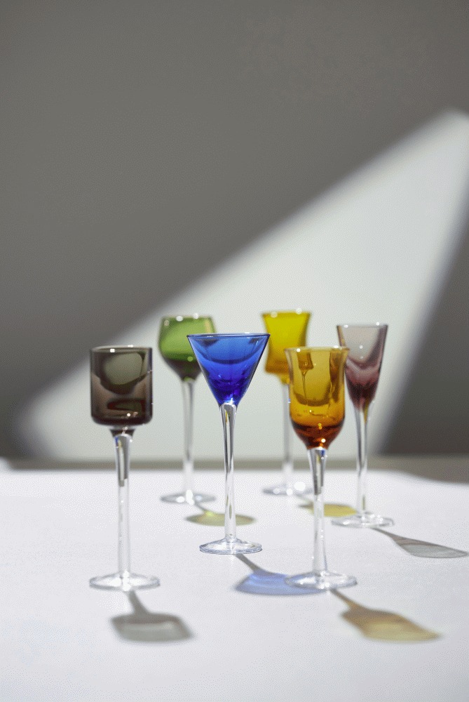 - Set mit 6 verschiedenen farbigen mundgeblasenen Schnapsgläsern
