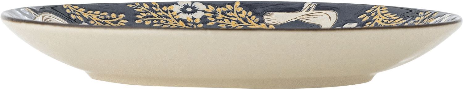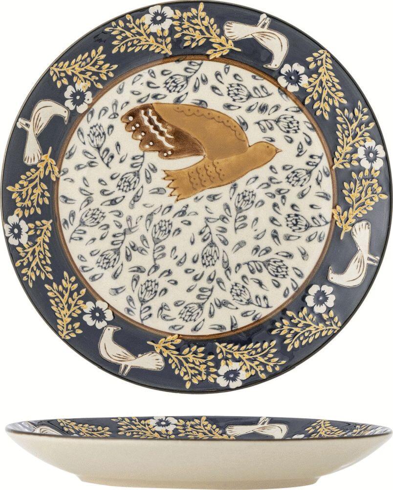 Mit diesem handbemalten Teller bringst du künstlerisches Handwerk und lebendige Farben direkt auf deinen Tisch. Der Hezha Teller von Bloomingville verbindet praktische Funktionalität mit einem einzigartigen Design, das sowohl alltägliche Mahlzeiten als auch festliche Anlässe bereichert. Das charakteristische blaue Motiv und die detailreichen Verzierungen schaffen ein visuelles Erlebnis, das sofort ins Auge fällt.Im Zentrum des Tellers zeigt sich ein goldbraun schimmernder Vogel im eleganten Flug, umgeben von sanften Blättern, die eine harmonische Balance zwischen Bewegung und Ruhe erzeugen. Dieses sorgfältig komponierte Motiv verleiht dem Teller einen künstlerischen Ausdruck, der Aufmerksamkeit erregt. Entlang des Randes entfaltet sich ein reich verziertes Band mit feinen Details aus Blumen, goldenen Zweigen und Vögeln in Bewegung. Diese liebevolle Dekoration verleiht dem Teller Tiefe und Charakter und unterstreicht zugleich das naturinspirierte Thema.