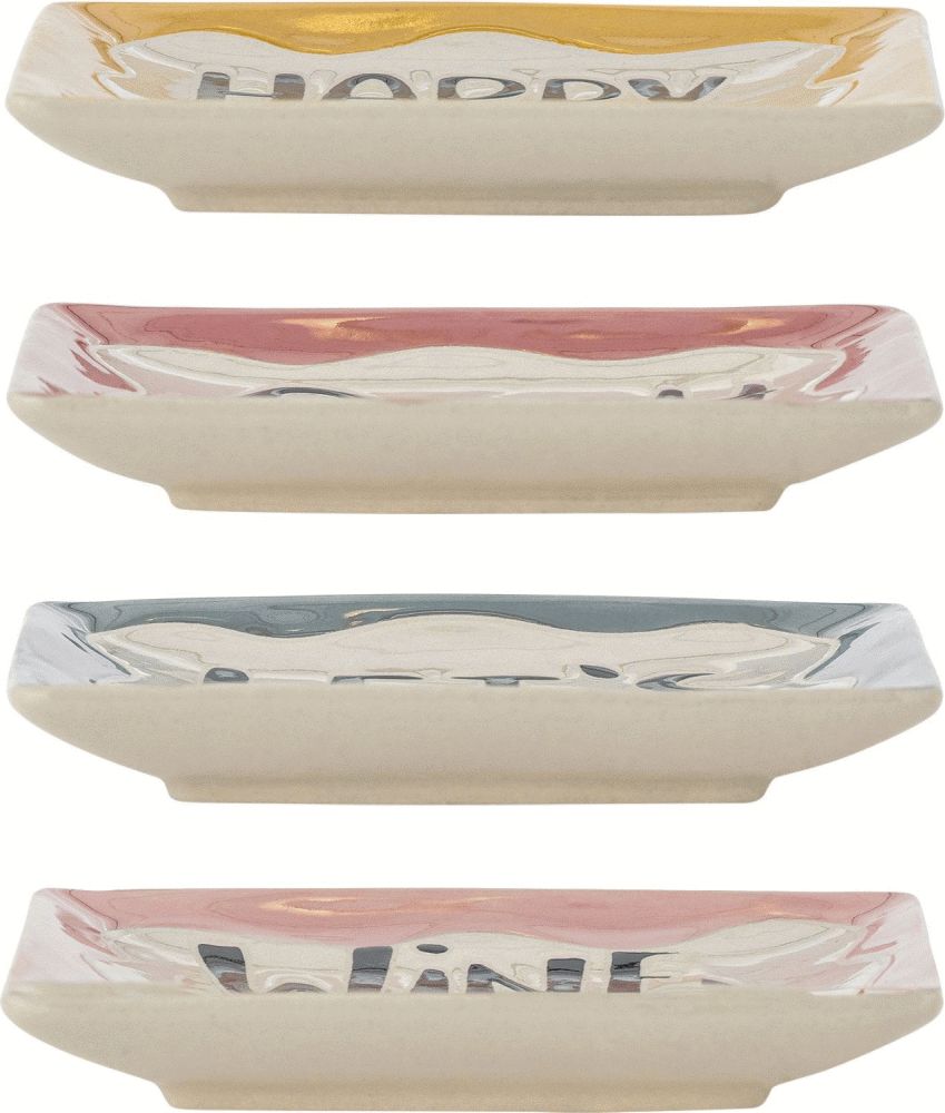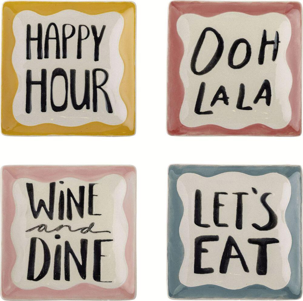 Mit diesem charmanten 4er-Set von Bloomingville holst du dir authentische Handwerkskunst und skandinavische Gemütlichkeit direkt auf deinen Tisch. Die vier quadratischen Teller aus robustem Steinzeug vereinen Funktionalität mit künstlerischem Ausdruck und verleihen jeder Tischdecke eine persönliche Note. Jeder Teller misst kompakte 13 x 13 cm und eignet sich hervorragend zum Servieren von Snacks, Desserts oder kleinen Anrichtungen, die eine stilvolle Präsentation verdienen.Das Besondere an den Soline Tellern liegt in ihrer handbemalten Oberfläche, die in warmen, gedämpften Nuancen gehalten ist. In der Mitte ziert ein cremefarben lackiertes Feld jeden Teller, auf dem handgeschriebene Texte für einen individuellen Charakter sorgen. Da jeder Teller von Hand bemalt wird, wirst du dezente Variationen in Muster und Farbintensität entdecken – kleine Unterschiede, die jeden einzelnen Teller zu einem Unikat machen und die Authentizität des Handwerks unterstreichen.