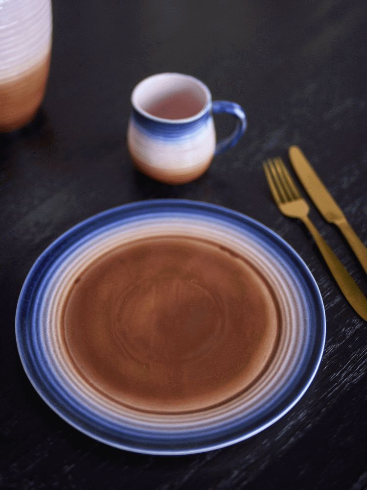 Die robuste Beschaffenheit des Steinzeugs wird durch eine glasierte Oberfläche veredelt, die nicht nur für eine glatte und pflegeleichte Reinigung sorgt, sondern auch die Tiefe und Wärme der Farben hervorhebt. Die terrakottafarbene Mitte bildet einen natürlichen Kontrast zu den umliegenden Tönen und macht jeden Teller zu einem echten Blickfang auf deinem Tisch. Ob du rustikale oder moderne Akzente setzen möchtest – die getönten Farben lassen sich mühelos mit anderem Geschirr und Tischzubehör kombinieren.
