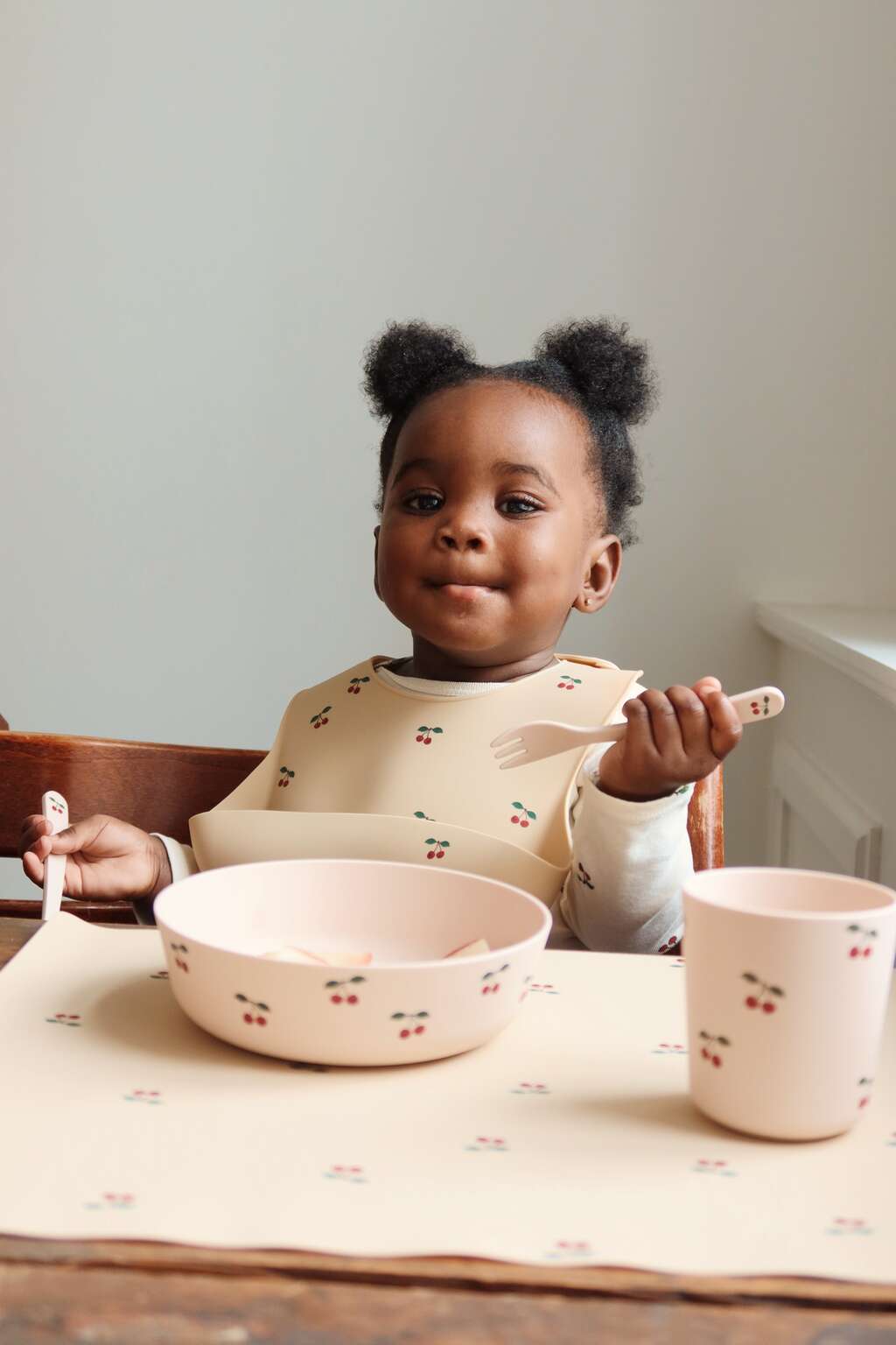 Die zeitlose Cherry-Farbe fügt sich harmonisch in jede Kücheneinrichtung ein und spiegelt Konges Sløjds charakteristische Designsprache wider – klare Linien und durchdachte Proportionen, die sowohl Kinder als auch Erwachsene ansprechen. Die kompakten Abmessungen machen das Set ideal für kleine Hände und es passt perfekt auf den Kindertisch oder in den Hochstuhl. Gleichzeitig ist es platzsparend zu verstauen.