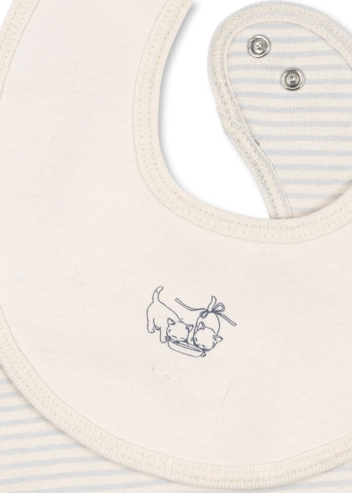 Die 2er-Pack Lösung erweist sich als besonders praktisch für vielbeschäftigte Eltern, da sie sicherstellt, dass immer ein sauberes Lätzchen bereitsteht, wenn es gebraucht wird. Das stilvolle Design mit den dezenten blauen Streifen macht die Lätzchen zu einem schönen Accessoire, das die Garderobe deines Kindes perfekt ergänzt.