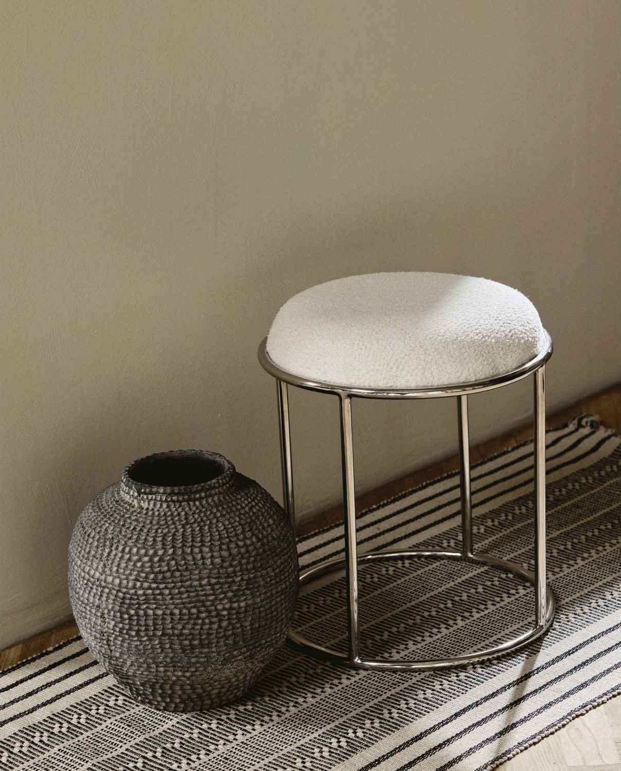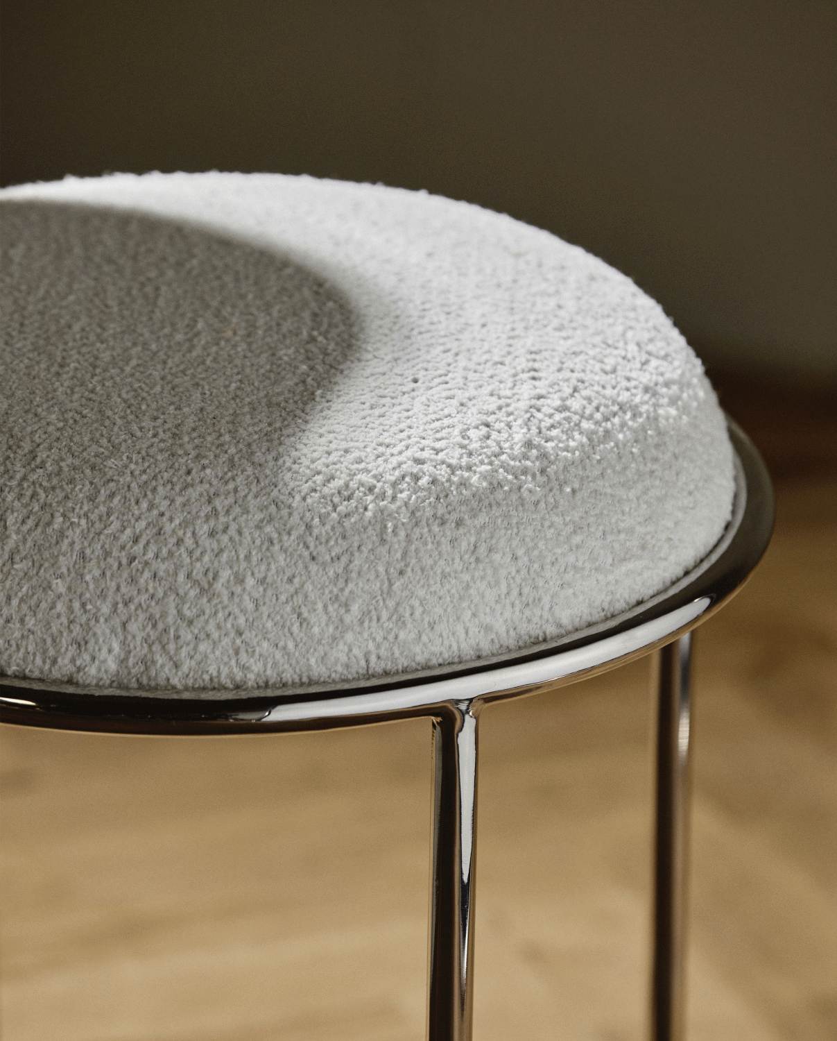 Das weich gepolsterte Sitzpolster aus hochwertigem Stoff bildet einen reizvollen Kontrast zum schlanken Stahlgestell, das dem Hocker seine charakteristische Leichtigkeit verleiht. Diese durchdachte Materialkombination gewährleistet nicht nur optimalen Sitzkomfort, sondern auch beeindruckende Langlebigkeit. Das minimalistische Design bewahrt dabei die elegante Ästhetik, die skandinavische Möbel so begehrenswert macht.