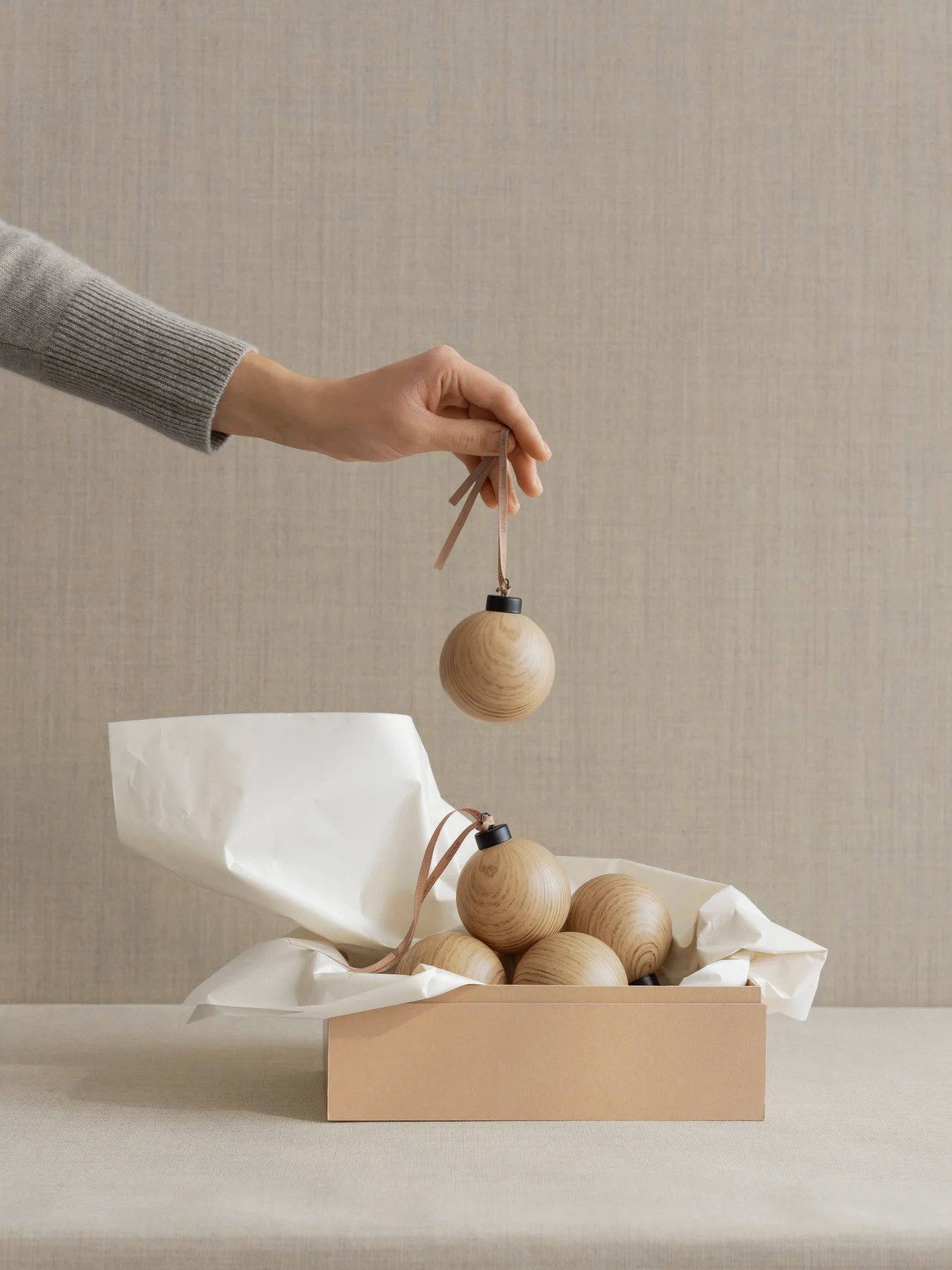 Jede Kugel wird sorgfältig aus mundgeblasenem Glas gefertigt und erhält durch ihre einzigartige Holzstruktur eine authentische, natürliche Anmutung. Die matte Oberflächenbehandlung unterstreicht den sophistizierten Charakter und sorgt dafür, dass diese Weihnachtskugeln nicht nur als saisonale Dekoration fungieren, sondern als stilvolle Gestaltungselemente, die sich harmonisch in jede Einrichtung einfügen.
