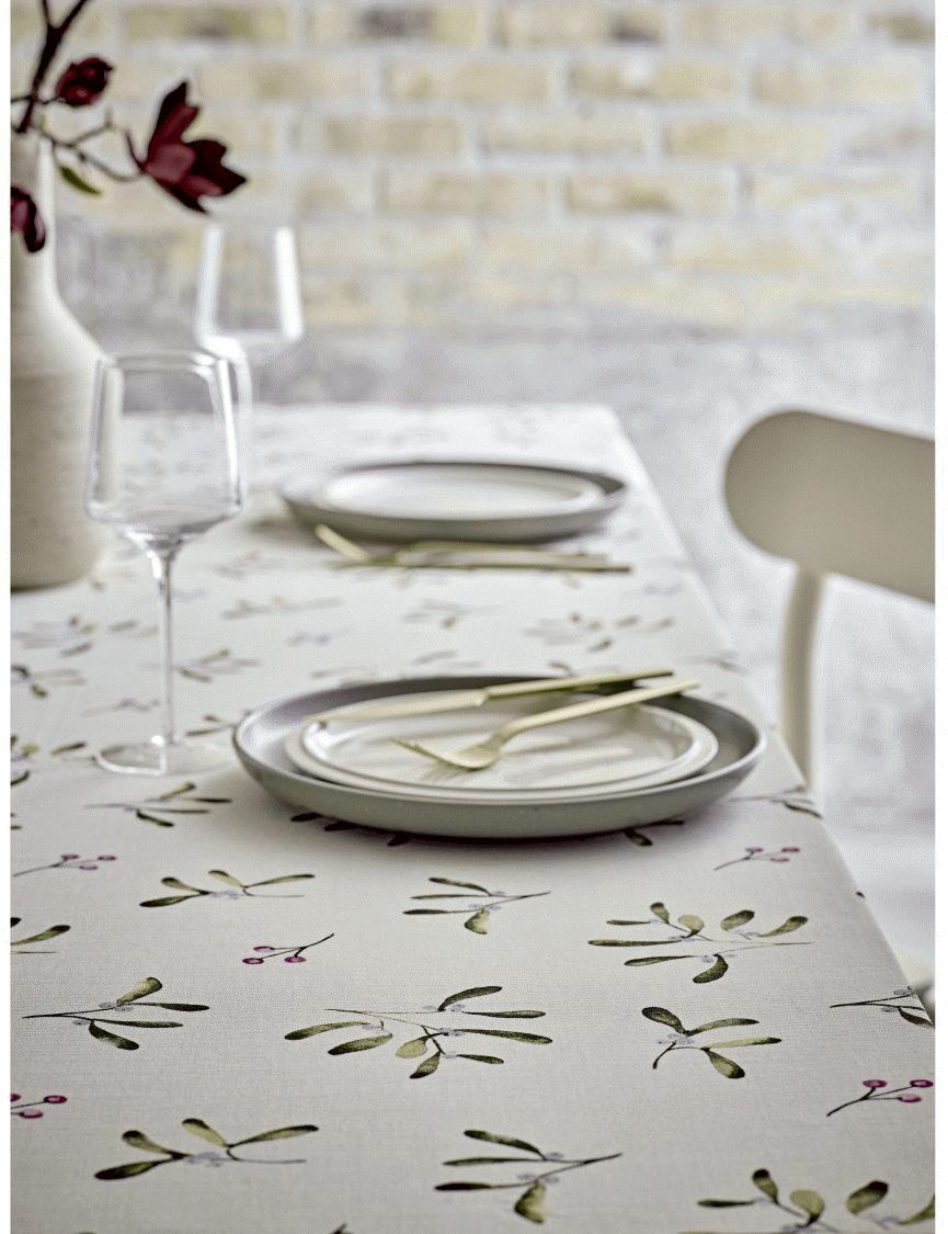 Das sorgfältig gestaltete Mistletoe-Muster besticht durch delikate Details, die ins Auge fallen, ohne überwältigend zu wirken. Die subtilen Farbtöne in Grün und Rosa schaffen eine raffinierte Balance, die sowohl moderne als auch klassische Tischdekorationen wunderbar ergänzt. Der leichte und luftige Ausdruck in der Nature-Farbe macht diese Tischdecke zu einer vielseitigen Wahl, die sich gleichermaßen für alltägliche Mahlzeiten wie für festliche Anlässe eignet.