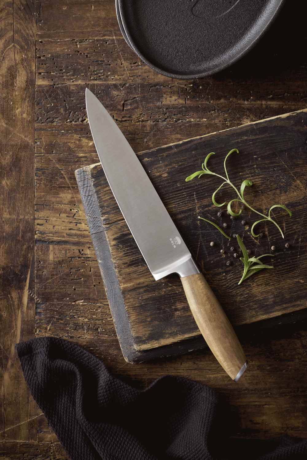 Mit diesem professionellen Kochmesser von HOLM holst du dir ein Stück skandinavische Designtradition in deine Küche. Das 33 cm lange Messer vereint außergewöhnliche Funktionalität mit handwerklicher Perfektion und macht jede Küchenarbeit zu einem besonderen Erlebnis. Ob feine Kräuter hacken, Fleisch schneiden oder Gemüse zerteilen – dieses Messer meistert alle großen Aufgaben in deiner Küche mit Leichtigkeit.