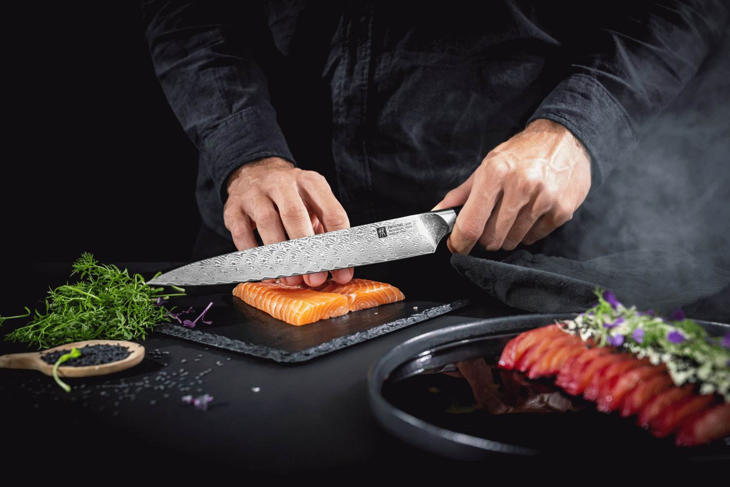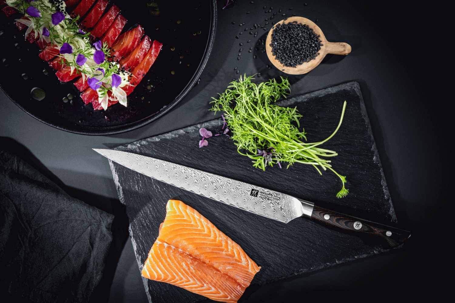 Mit diesem außergewöhnlichen Tranchiermesser holst du dir die perfekte Verbindung aus japanischer Präzision und deutscher Ingenieurskunst direkt in deine Küche. Das Zwilling Tanrei Tranchiermesser setzt völlig neue Maßstäbe für Schärfe und Langlebigkeit und bringt professionelle Leistung in dein modernes Kochambiente.Das charakteristische Damastmuster macht jede Klinge zu einem wahren Unikat - kein Messer gleicht dem anderen, und das kunstvolle Design zieht sich kontinuierlich von der Spitze bis zum Bolster. Diese beeindruckende Optik ist jedoch weit mehr als nur schöner Schein: Sie spiegelt die hochentwickelte Konstruktion mit 100 Lagen Premium-Stahl und einem FC 63 Kern wider, die eine Klinge mit einer außergewöhnlichen Härte von 63 HRC erschaffen.