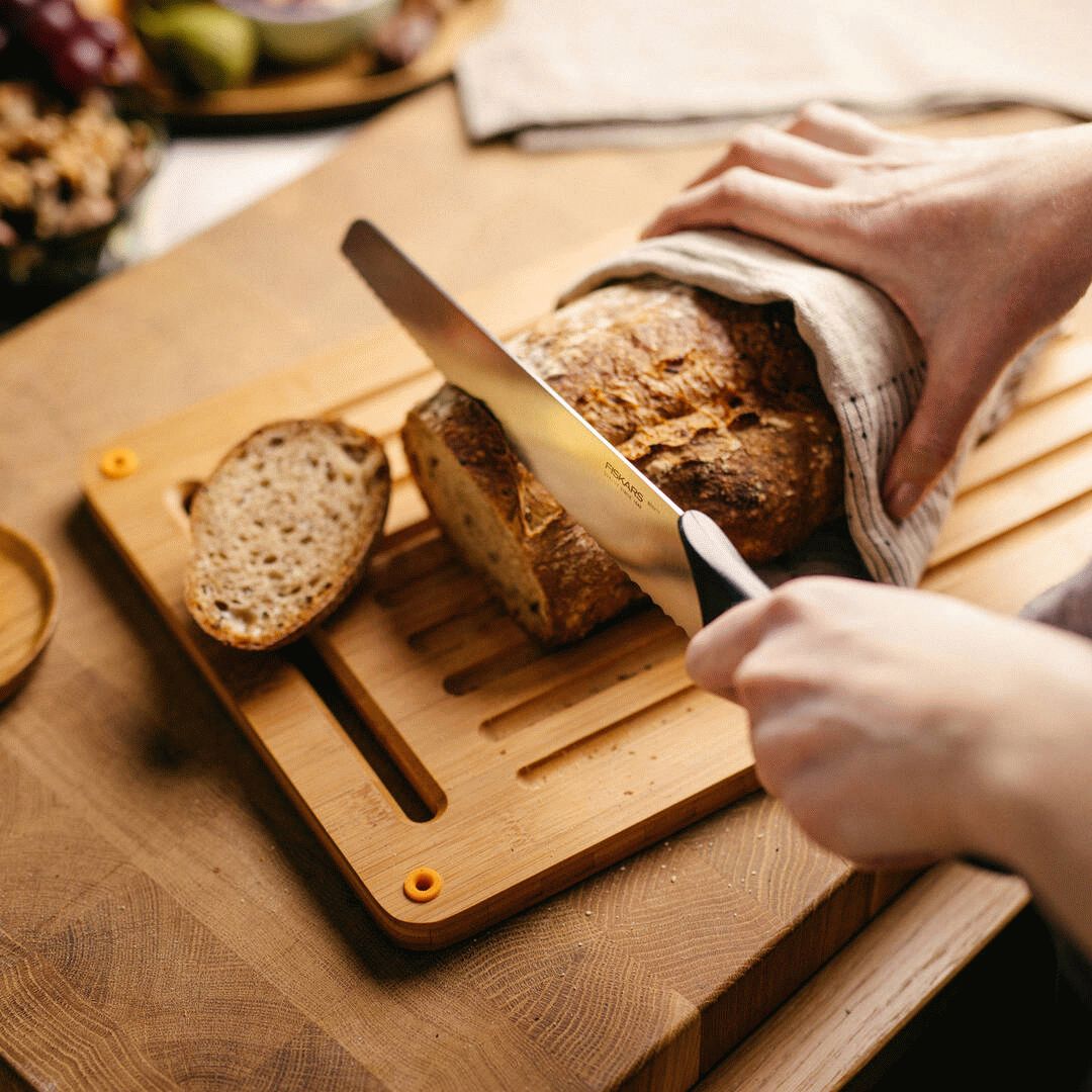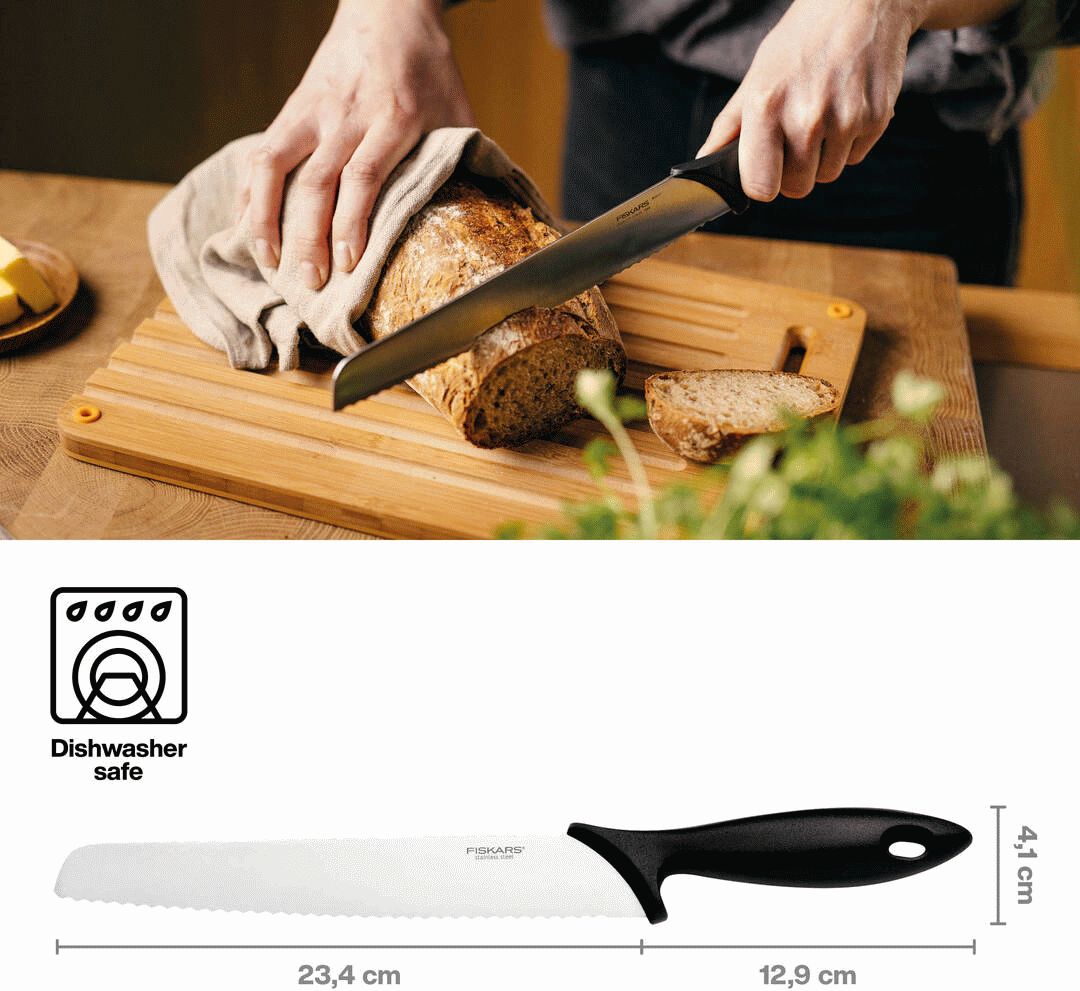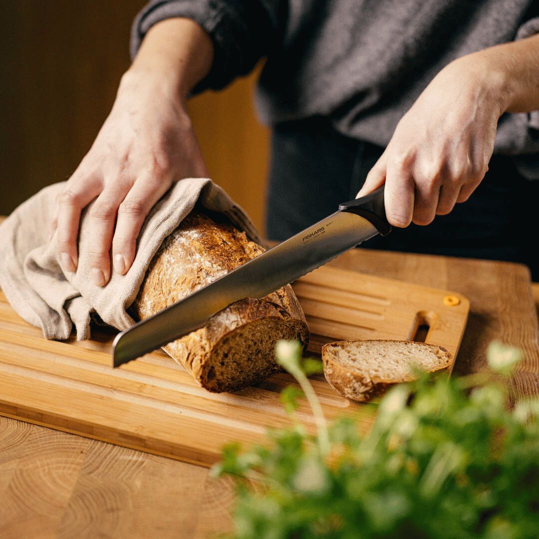 Mit diesem robusten Brotmesser von Fiskars bringst du professionelle Schneidleistung in deine Küche und meisterst mühelos jede Brotsorte. Das 23 cm lange Messer aus der bewährten Essential-Serie vereint skandinavische Designtradition mit außergewöhnlicher Funktionalität und macht das tägliche Brotschneiden zu einem wahren Vergnügen.Die speziell entwickelte Sägekantenklinge mit ihren effektiven Sägezähnen gleitet mühelos durch selbst die härtesten Brotkrusten, ohne dabei das Brot zu zerdrücken oder seine Struktur zu beschädigen. Ob knusprige Baguettes, schweres Roggenbrot oder zarte Weißbrotlaibe - dieses vielseitige Werkzeug bewältigt alle Brotsorten mit beeindruckender Präzision und sorgt für saubere, gleichmäßige Scheiben.