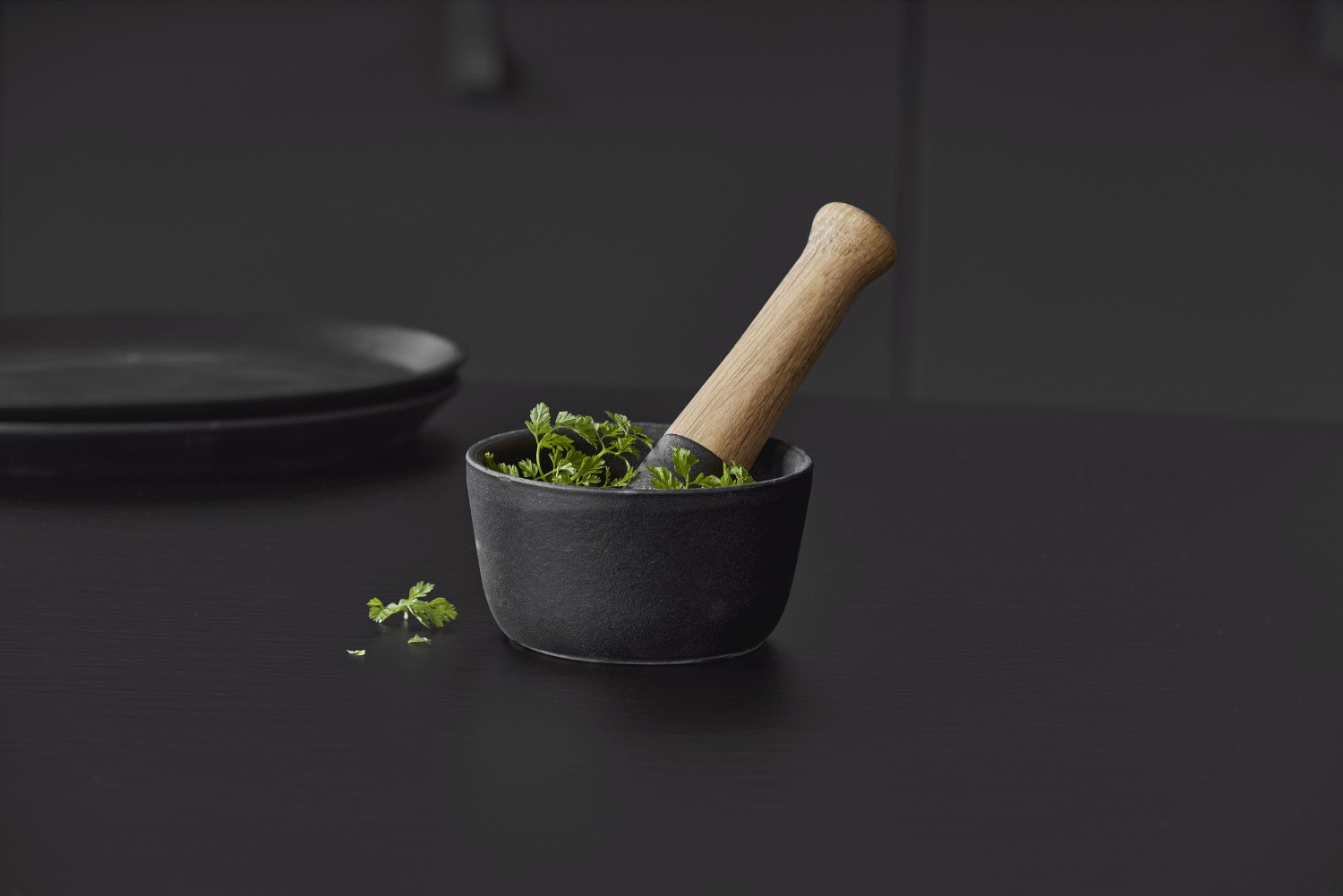 Der funktionale Mörser ermöglicht dir das perfekte Zerkleinern von Gewürzen, Kräutern und anderen Zutaten, wodurch deren volles Aroma und Geschmack in deinen Kochkreationen freigesetzt wird. Die stabile Gusseisenkonstruktion sorgt für optimale Stabilität während der Nutzung, während der 17,5 cm lange Stößel aus FSC®-zertifiziertem Eichenholz einen angenehmen Griff und effizientes Mahlen gewährleistet.