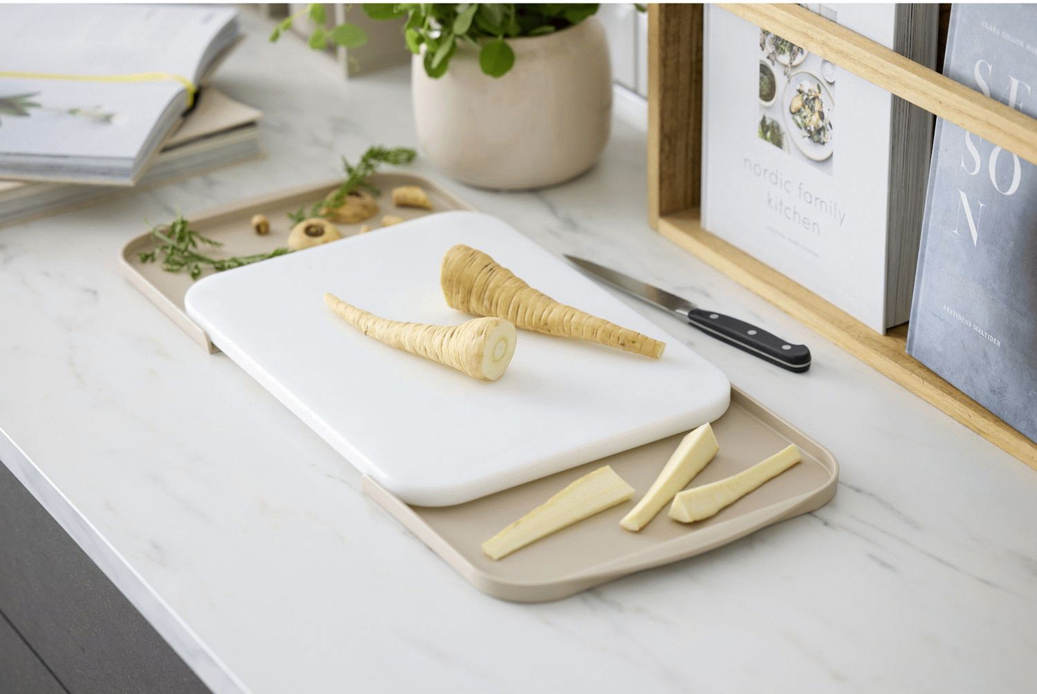 Dieses durchdachte Schneidebrett verwandelt deine Küchenarbeit in ein organisiertes und effizientes Erlebnis, bei dem du dich voll und ganz auf das Zubereiten köstlicher Gerichte für Familie und Freunde konzentrieren kannst. Das Rosti Separa Schneidebrett mit Wannen vereint professionelle Küchenfunktionalität mit skandinavischem Design und bringt hochwertige Qualität direkt in dein Zuhause.Hergestellt aus HDPE (High-Density-Polyethylen), einem robusten Material, das in professionellen Küchen weltweit zum Einsatz kommt, überzeugt dieses Schneidebrett durch seine außergewöhnliche Langlebigkeit. Das Material wird aus einem massiven Block harter Kunststoffmasse geschnitten, was eine stabile und widerstandsfähige Konstruktion gewährleistet, die jahrelangem täglichen Gebrauch standhält. HDPE zeichnet sich durch geringe Feuchtigkeitsaufnahme und hohe Beständigkeit gegenüber Säuren und Basen aus, wodurch es sich ideal für alle Lebensmittelarten eignet. Gleichzeitig schont das Material deine Messer, sodass sie länger scharf bleiben.