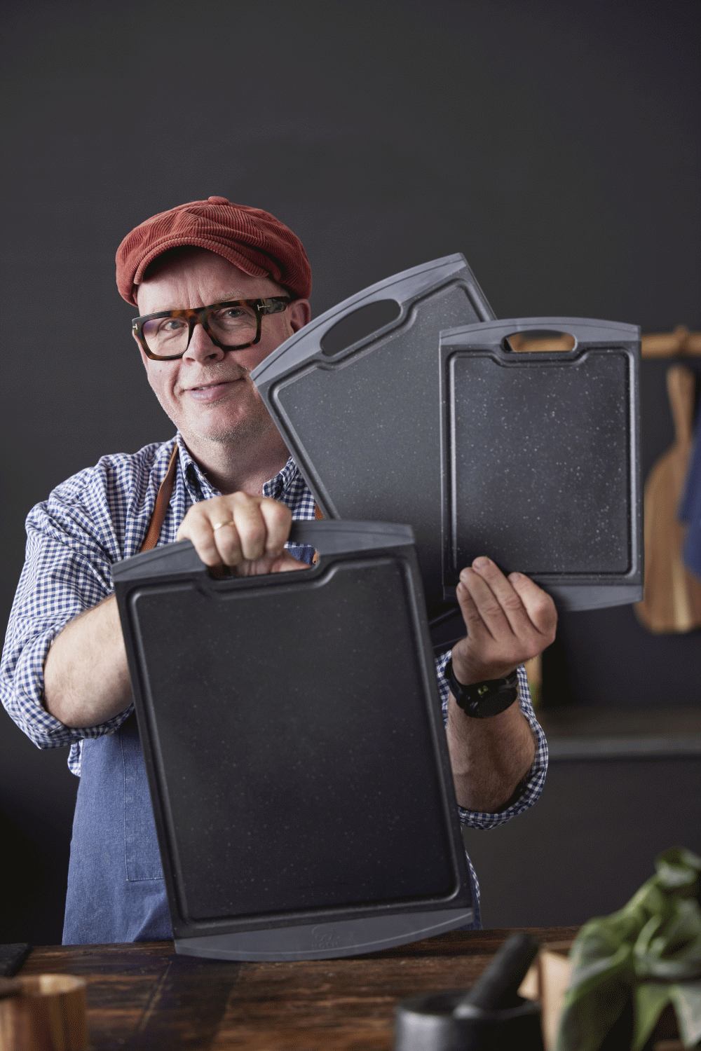 Mit diesem durchdachten HOLM Schneidebrett bringst du Funktionalität und Sicherheit in dein Küchenalltag, während das moderne Design perfekt zu deiner Kücheneinrichtung passt. Das robuste Brett in der praktischen Größe von 44,5 x 30,5 x 1 cm überzeugt durch clevere Details, die das Kochen und Zubereiten deutlich erleichtern.Die graue Gummikante aus TPE-Material, die das gesamte Schneidebrett umrahmt, ist weit mehr als nur ein optisches Highlight. Diese durchdachte Konstruktion sorgt für maximale Stabilität während der Nutzung, sodass das Brett auch beim Schneiden harter Gemüsesorten oder beim Verarbeiten größerer Fleischstücke sicher auf deiner Arbeitsfläche bleibt. Die rutschfesten Enden garantieren dir einen festen Halt auf jeder Küchenoberfläche.