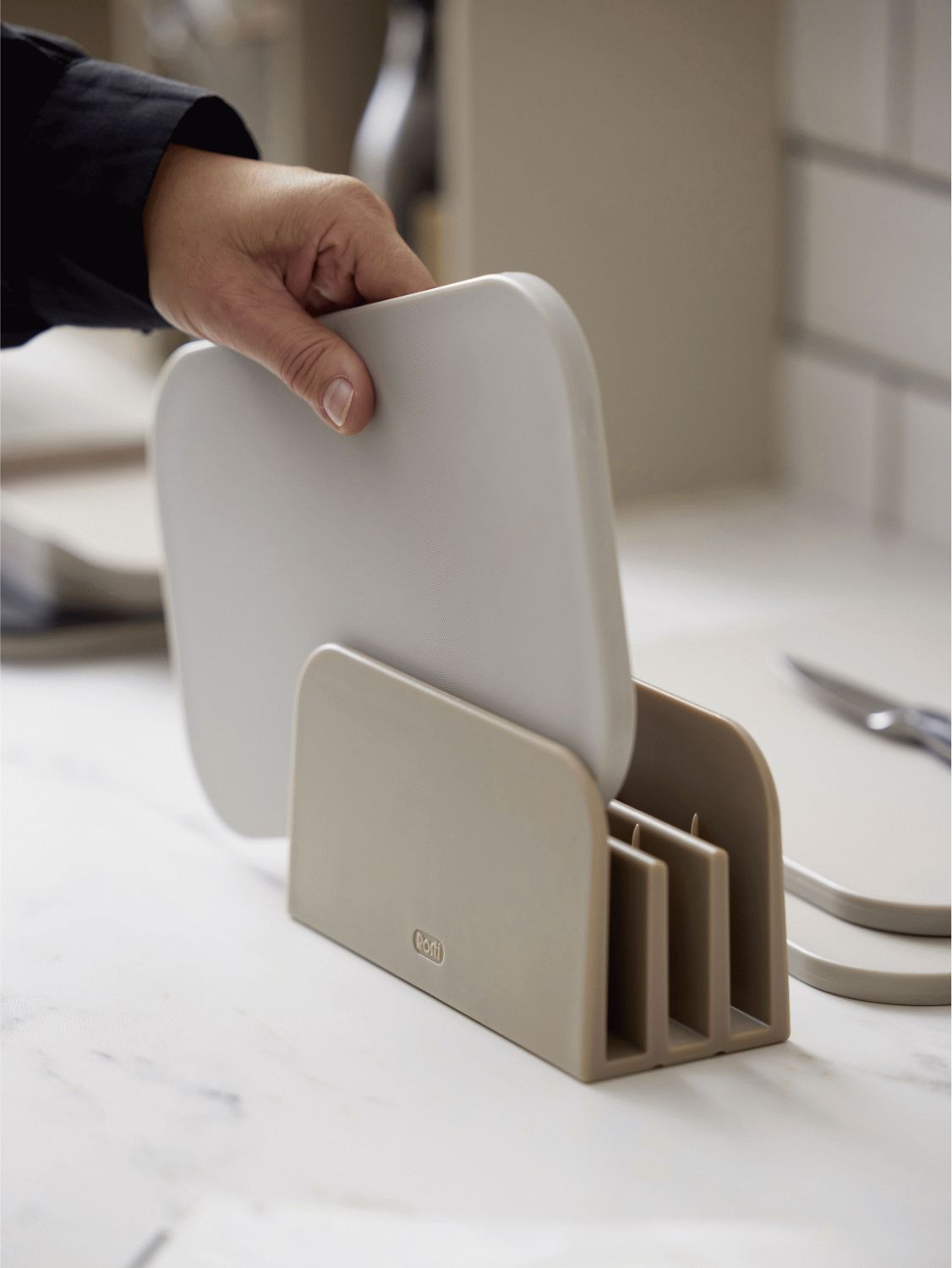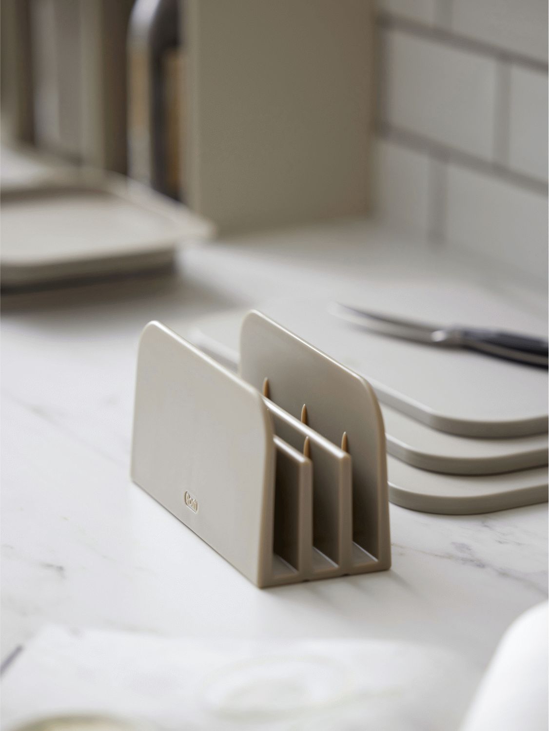 Die robuste Polypropylene-Konstruktion in der eleganten Humus-Farbe überzeugt durch Langlebigkeit und passt sich harmonisch in jede Küchengestaltung ein. Du kannst deine Schneidebretter nach dem Gebrauch oder Spülen direkt in die Halterung stellen, was nicht nur für Ordnung sorgt, sondern auch die Lebensdauer deiner Bretter durch bessere Trocknung verlängert.
