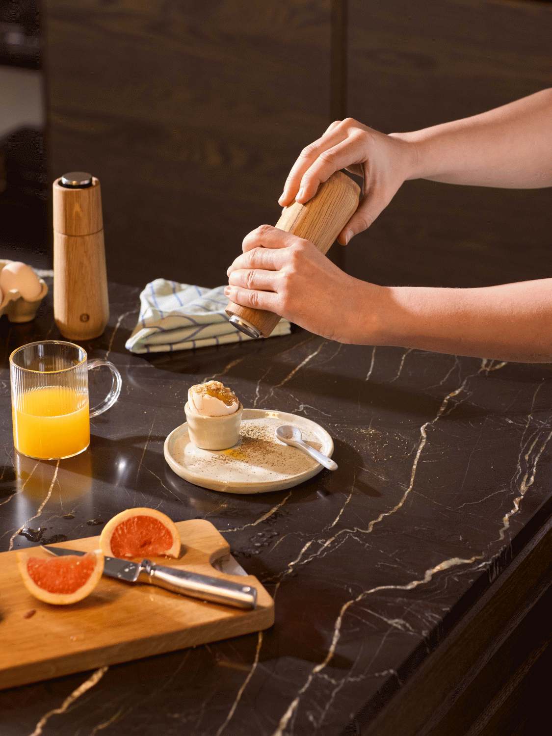 Das von Crushgrind® in Zusammenarbeit mit Sam Murley entworfene Design spiegelt die skandinavische Designtradition mit klaren Linien und funktionaler Eleganz wider. Es passt perfekt zu den Champagne-Mühlen und schafft einen harmonischen Look auf deiner Küchenarbeitsplatte.