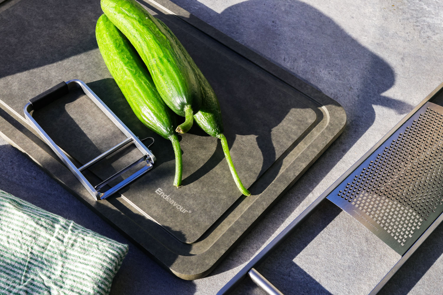 Die vier strategisch platzierten Silikonfüße auf der Unterseite sorgen für perfekte Stabilität während der Nutzung, sodass das Brett nicht auf der Arbeitsplatte herumrutscht. Dieses Detail zeigt Endeavours Aufmerksamkeit für Benutzererfahrung und Sicherheit in der Küche.