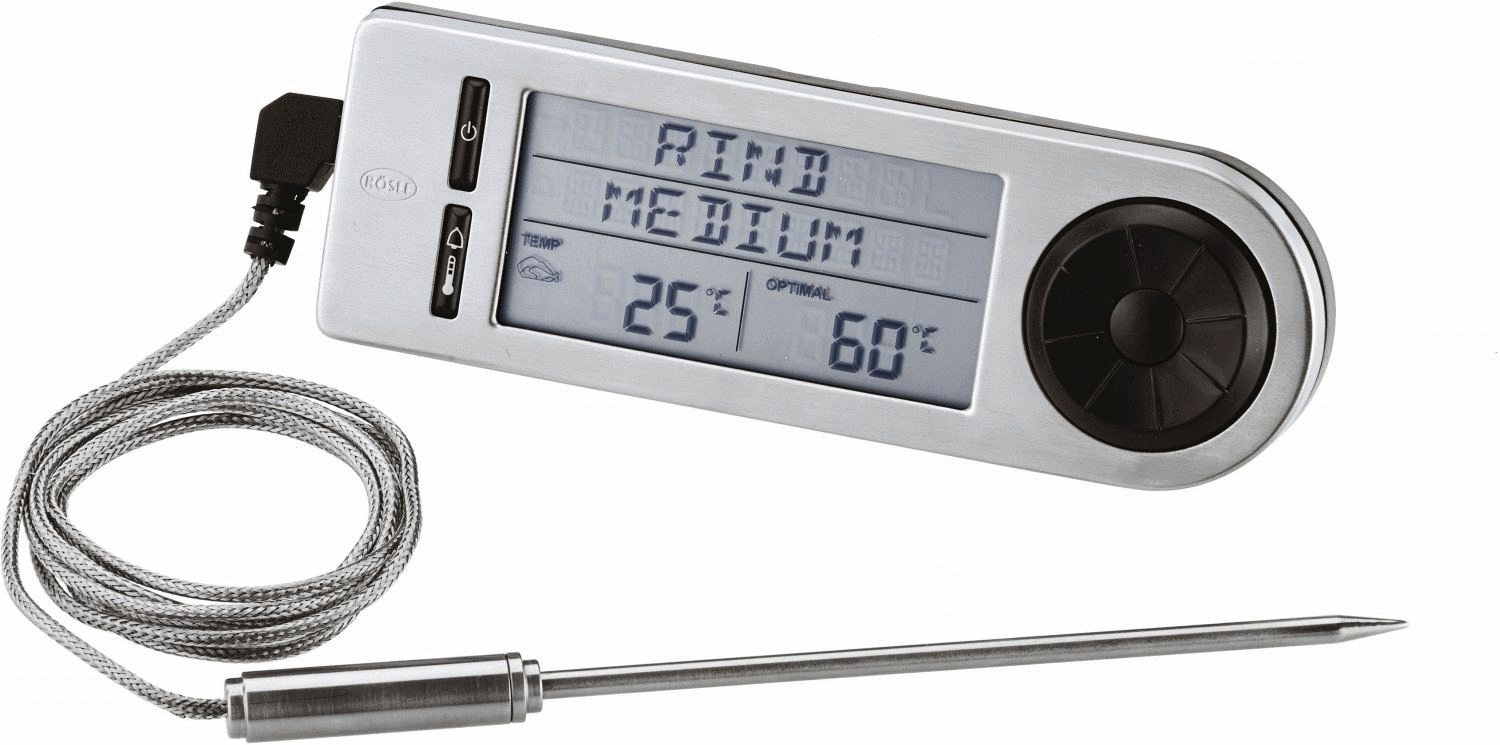 Mit diesem präzisen Bratenthermometer von Rösle erhältst du die vollständige Kontrolle über deine Fleischzubereitung und verwandelst jede Mahlzeit in ein kulinarisches Meisterwerk. Das hochwertige Gerät aus rostfreiem Stahl kombiniert innovative Dual-Sensor-Technologie mit benutzerfreundlichem Design und ermöglicht dir, sowohl die Kerntemperatur des Fleisches als auch die Ofen- oder Grilltemperatur gleichzeitig zu überwachen.Die fortschrittliche Doppelsensorfunktion macht dieses digitale Thermometer zu einem unverzichtbaren Werkzeug für Kochbegeisterte, die perfekte Ergebnisse erzielen möchten. Du kannst die ideale Kerntemperatur für fünf verschiedene Fleischsorten bestimmen und somit garantiert perfekt zubereitete Gerichte für deine Gäste servieren. Das klare digitale Display zeigt alle wichtigen Temperaturdaten übersichtlich an und ist selbst unter anspruchsvollen Kochbedingungen problemlos ablesbar.