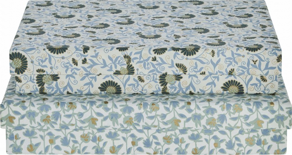 Die beiden rechteckigen Boxen in Weiß und Blau bestechen durch ihre femininen Muster in sanften Nuancen, die sich nahtlos in die skandinavische Einrichtung einfügen. Ob auf dem Schreibtisch, im Regal oder als dekoratives Element im Schlafzimmer – diese Aufbewahrungslösungen organisieren deine Büroartikel, Fotografien, Briefe oder andere kleine Gegenstände auf besonders stilvolle Weise.