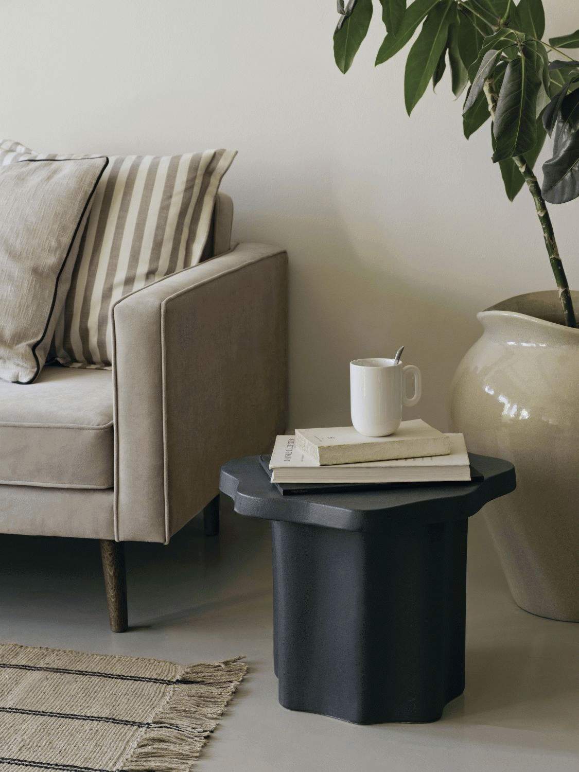 Dieser elegante Beistelltisch aus Steingut vereint skandinavisches Handwerk mit zeitloser Ästhetik und verleiht jedem Raum eine besondere Note. Mit seiner kompakten Größe von 42,5 cm Breite und 36 cm Höhe fügt sich das Möbelstück harmonisch in kleine wie große Wohnbereiche ein und setzt dabei charaktervolle Akzente, ohne aufdringlich zu wirken.Das Besondere an diesem Tisch ist seine Fertigung aus hochwertigem Steingut, einem Material, das dem Möbel eine einzigartige Textur und visuelle Tiefe verleiht. Die schwarze Oberfläche strahlt eine zeitlose Eleganz aus, die sich mühelos in unterschiedliche Einrichtungsstile integrieren lässt – ob in deinem modernen skandinavischen Zuhause oder in klassischeren Interieurs. Dank der natürlichen Eigenschaften des Steinguts erhält jeder Tisch sein ganz eigenes Erscheinungsbild, da das Material leicht in Nuancen und Finish variieren kann. Diese individuelle Note macht jedes Stück zu einem Unikat.