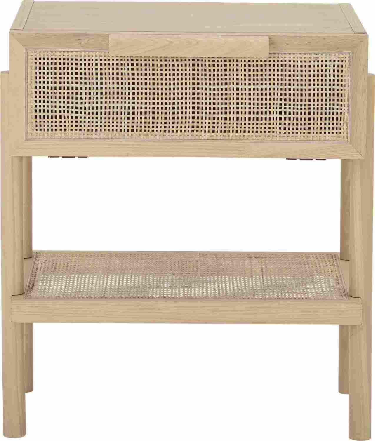Mit diesem charmanten Beistelltisch von Bloomingville holst du dir skandinavische Eleganz und durchdachte Funktionalität in dein Zuhause. Der Manon Beistelltisch vereint nachhaltiges FSC-zertifiziertes Kiefernholz mit raffinierten Rattan-Details zu einem vielseitigen Möbelstück, das sowohl als Beistelltisch, Nachttisch oder eigenständiges Dekoelement überzeugt.Die natürliche Holzstruktur der Kiefer schafft eine warme, einladende Atmosphäre in deinem Wohnbereich, während die eleganten Rattan-Akzente dem Design einen sophistizierten Touch verleihen, der für skandinavisches Design so charakteristisch ist. Das FSC-zertifizierte Kiefernholz und Holzfurnier garantieren nicht nur höchste Qualität, sondern auch umweltbewusstes Wohnen.