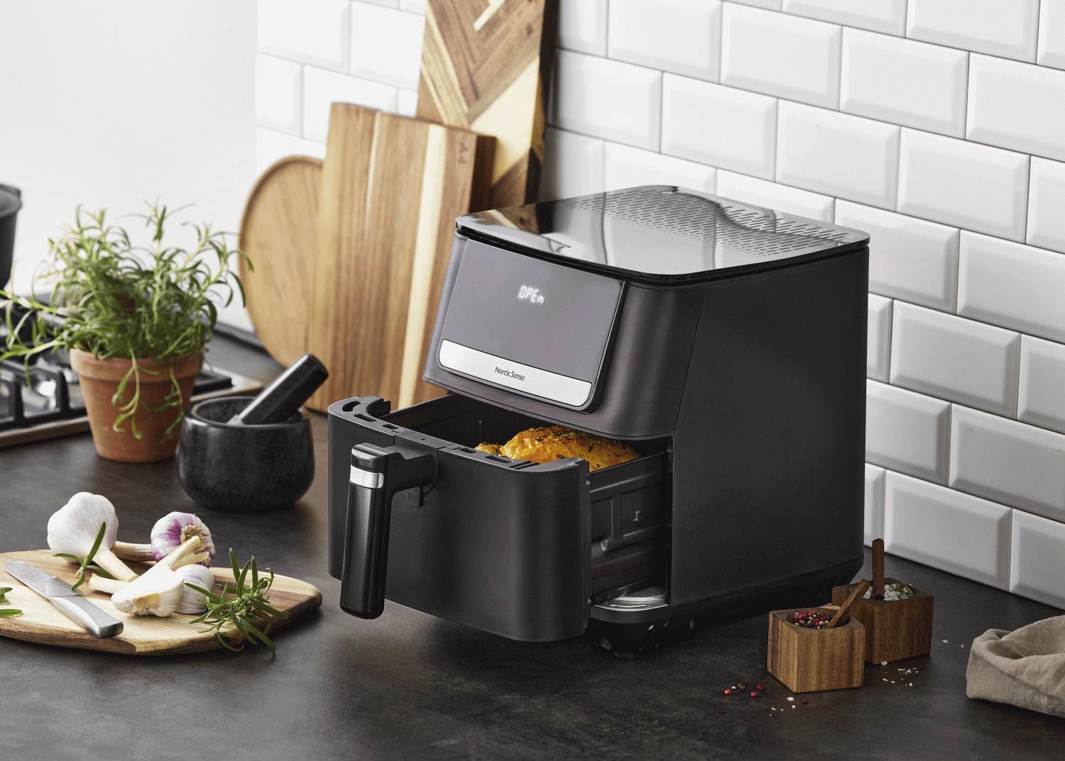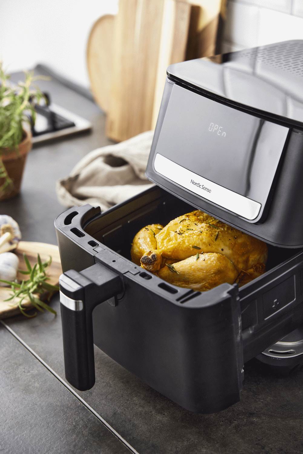 Mit dieser Skandinavischen Sense Heißluftfritteuse revolutionierst du deine tägliche Küche durch die perfekte Kombination aus skandinavischer Funktionalität und modernster Kochtechnologie. Die großzügige 6,5-Liter-Kapazität macht sie zur idealen Lösung für Familien, die gesunde und schmackhafte Gerichte ohne Kompromisse bei Geschmack oder Textur zubereiten möchten.Die fortschrittliche Heißluftzirkulation sorgt dafür, dass jedes Gericht die perfekte Balance zwischen knuspriger Oberfläche und saftigem Inneren erhält. Dank der strategisch platzierten Heizelemente sowohl oben als auch unten erreichst du eine gleichmäßige Wärmeverteilung, die es ermöglicht, alles von knusprigen Pommes frites bis hin zu zarten Hähnchenstücken mit minimalem Ölverbrauch zuzubereiten.
