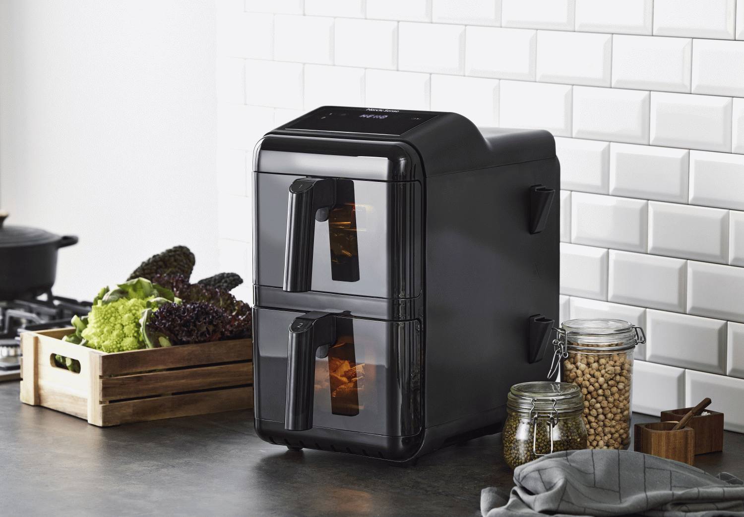 Besonders praktisch sind die beiden gestapelten Schubladen mit jeweils 5,8 Litern Fassungsvermögen. Jede Schublade verfügt über einen verstellbaren Rost, wodurch du bis zu vier verschiedene Speisen gleichzeitig garen kannst. Die durchdachten Sichtfenster in beiden Schubladen ermöglichen es dir, den Garvorgang zu überwachen, ohne die Luftzirkulation durch Öffnen zu unterbrechen.
