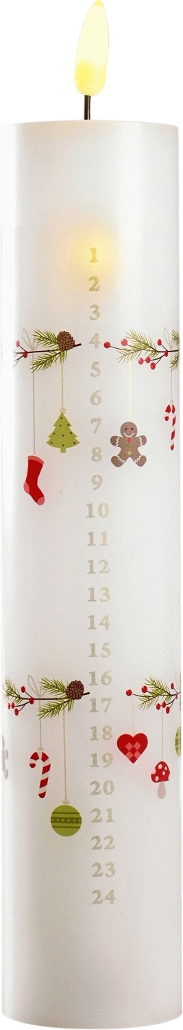 Das 24,5 cm hohe Kalenderlicht mit einem Durchmesser von 5 cm besteht aus echtem Wachs und überzeugt durch seine authentische Optik. Die integrierte LED-Funktion ermöglicht es dir, jeden Tag sicher das warme, sanfte Licht zu genießen, während du die Tage bis Heiligabend herunterzählst. Keine Sorge vor offenen Flammen – diese durchdachte Technologie macht die Kerze besonders familienfreundlich.
